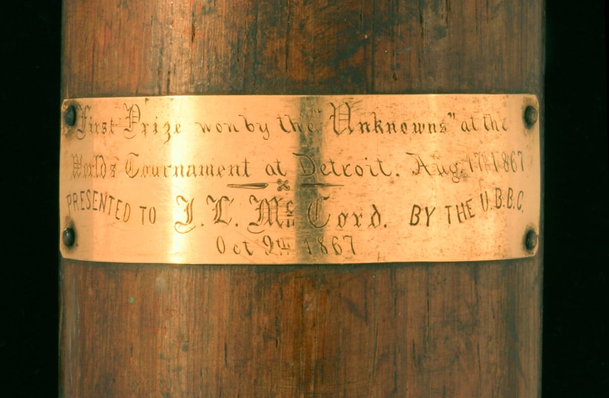 The Unknown Base Ball Club of Jackson, Michigan, rallied to win the first-class title at the 1867 World's Base Ball Tournament in Detroit. Their prize was this rosewood bat originally embellished with gold mounts. At the end of the season the team presented this bat to their star pitcher, John L. McCord.