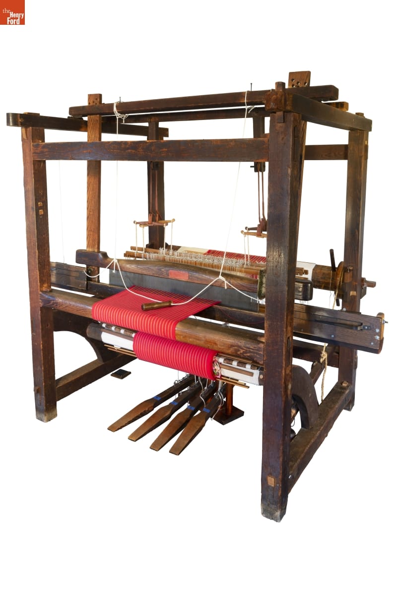 This loom, made in Greenfield Village in the early 1930s, has a special attachment--a flying shuttle. Developed in the 1730s, the flying shuttle dramatically increased weavers' output. This device allowed weavers to send the shuttle, which carries the thread, back and forth using only one hand. With a flying shuttle, weavers could produce wider, better-quality cloth more quickly and with less effort.