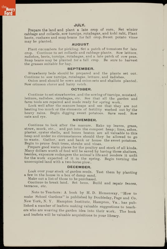 Among George Washington Carver's contributions were the bulletins he issued from the Agricultural Experiment Station at the Tuskegee Institute. This pamphlet, written for teachers, treats the popular topic of "nature study," the early 20th century's version of environmental education. It was a guide for educators wanting to involve school children in gardening to help prepare them for successful farming careers. Carver's nature study bulletins emphasized both aesthetic and scientific understandings of nature and were popular across the country.
