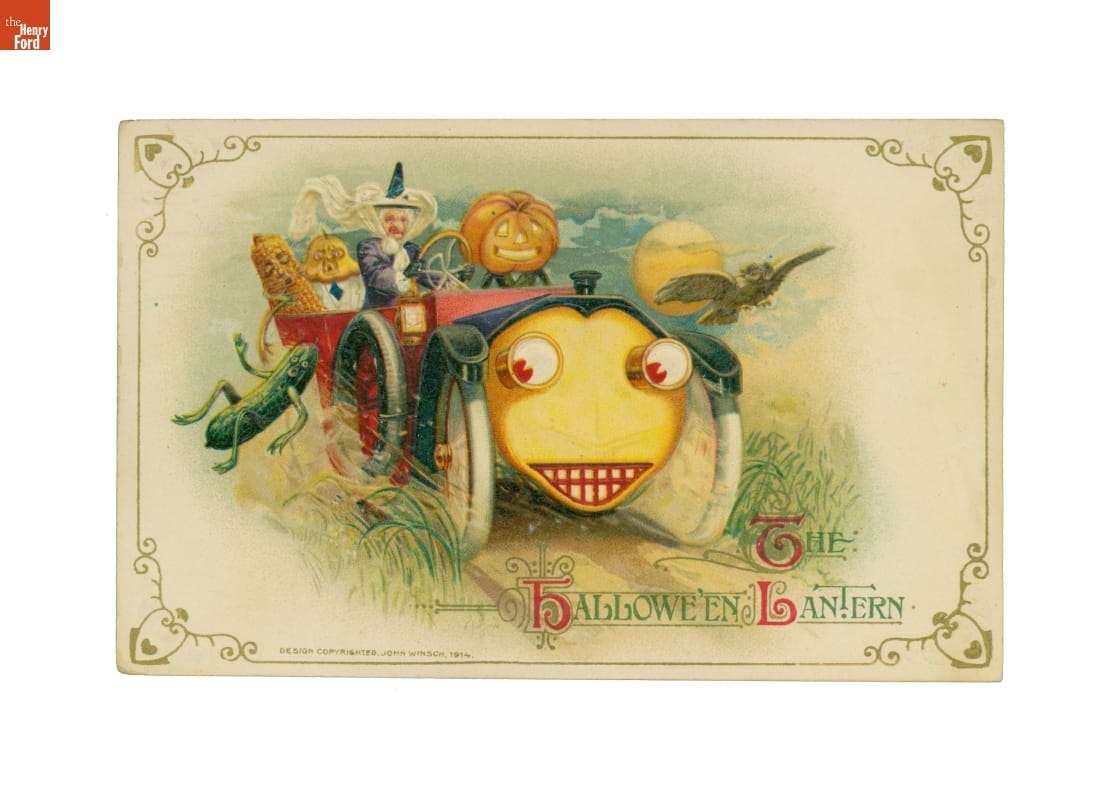 Halloween's superstitious origins gave way to a national celebration of mystery and innocent fun in 20th-century America. Seasonal greeting postcards commonly exchanged by friends and neighbors during Halloween reflected a distinctly American blend of olden customs and modern life. This colorful example from 1914 combines traditional superstitious symbols with a contemporary automobile.