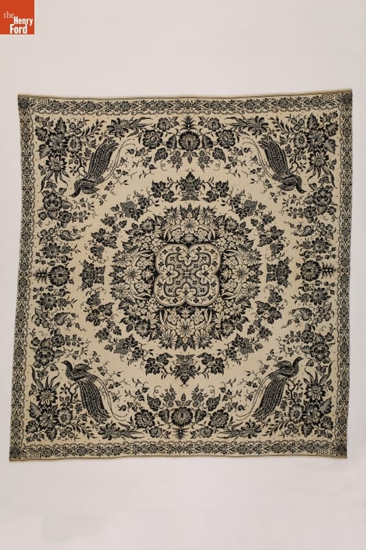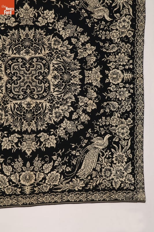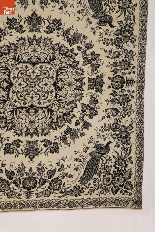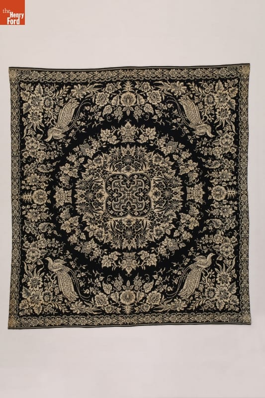 A coverlet is a decorative bedcovering--usually made of cotton and wool--woven on a loom. Most fancy coverlets were woven in two panels and joined at the middle with a sewn seam. However, this coverlet has no seam, indicating that its weaver had a very wide loom capable of producing a fabric with a width of almost 87 inches.