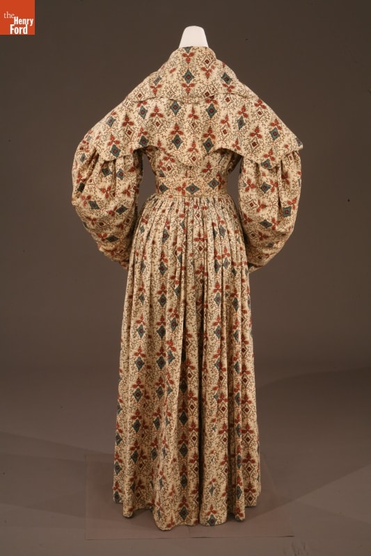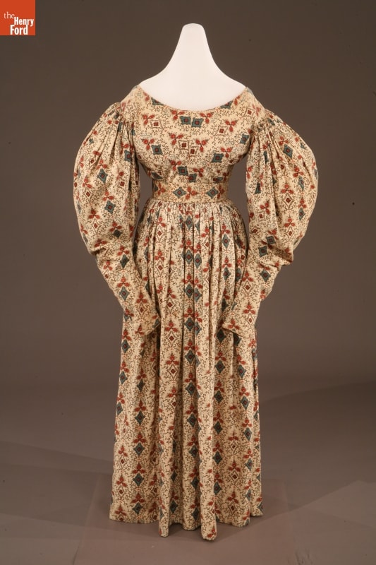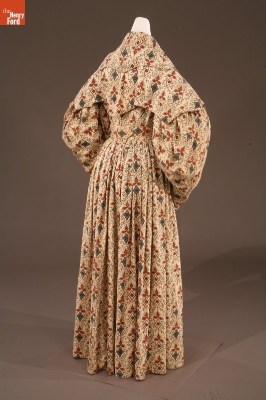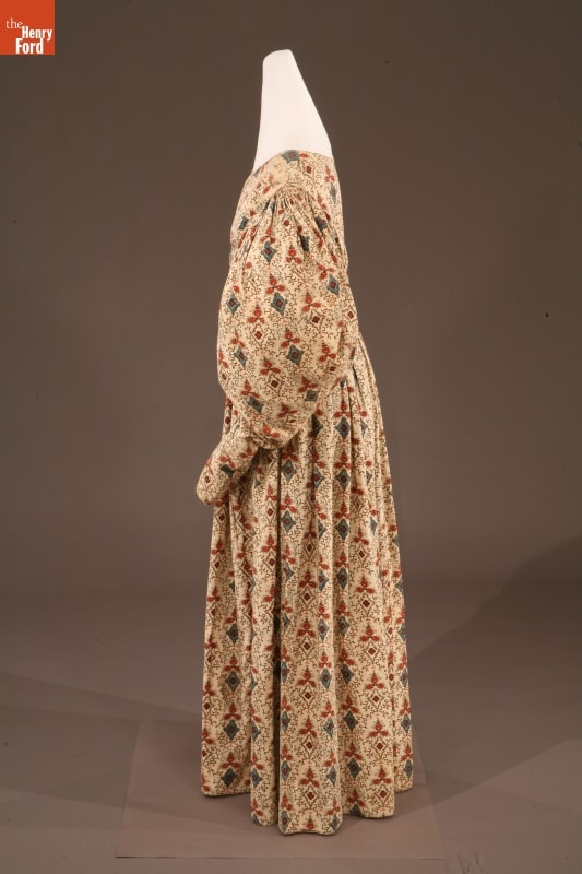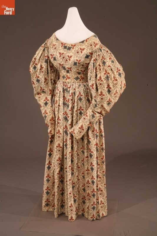 By the 1830s, factories in New England were able to produce a staggering 120 million yards of printed cotton textiles each year. People eagerly purchased these fabrics for dress goods, shirting, and home furnishings. This dress was later owned by children's author and illustrator Tasha Tudor, who lived a lifestyle reminiscent of the 1830s on her New Hampshire farm. Tudor used her collection of antique clothing as inspiration for her artwork.