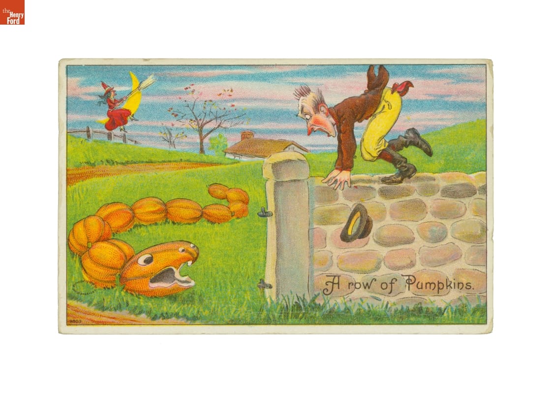 A distinctly American blend of Halloween traditions emerged by the late 1800s. Into the 20th century, the holiday was mostly an innocent celebration of mystery and fun, but friends and neighbors often exchanged seasonal greeting postcards that evoked Halloween's superstitious origins. This colorful example includes a witch and a jack-o-lantern -- two symbols of Halloween's superstitious origins.
