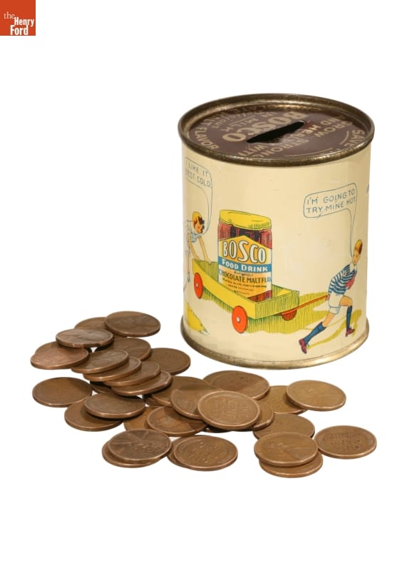 Despite critics' warnings about tooth decay, acne, and weight gain, chocolate drinks began to be promoted as a nutritional health food for children during the 1920s. Bosco, a chocolate syrup introduced 1928, was advertised as a good way to get children to drink more milk. This bank might have been a promotional giveaway.