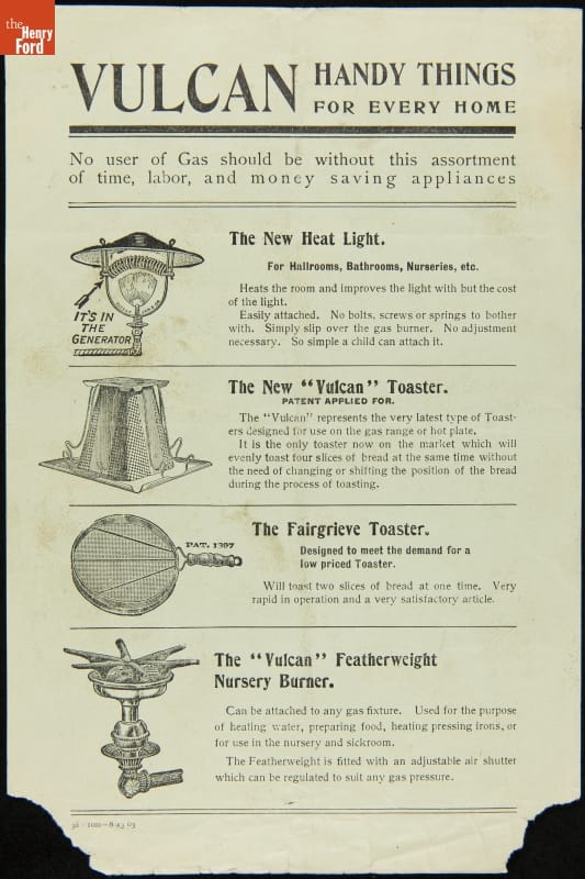 Printed at top of page: Vulcan / Handy Things / for every Home Printed in the middle of the page beside the illustrations is additional text that reads in part: The New Heat Light / The New "Vulcan" Toaster / The Fairgrieve Toaster / The "Vulcan" Featherweight Nursery Burner Printed beside toaster: The "Vulcan" represents the very latest type of toasters / designed for use on the gas range or hot plate. / It is the only toaster now on the market which will / evenly toast four slices of bread at the same time without / the need of changing or shifting the position of the bread / during the process of toasting. Printed at bottom of page on the back side: Manufactured by / William M. Crane Company / New York Handwritten in pencil on back of page: 96th St.- Bway Wm Bell Printed in very small numbers on lower front: 38-10M- 8-23-05