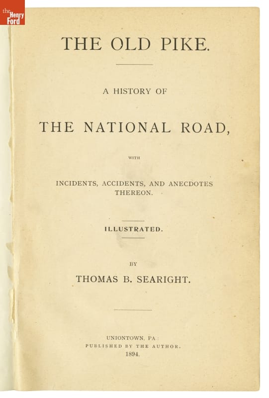 On spine of cover: THE / OLD PIKE / A HISTORY OF / THE NATIONAL ROAD / T. B. SEARIGHT / 1894 Ink stamp on back of title page: Ford Motor Company / LIBRARY / DEARBORN, MICHIGAN