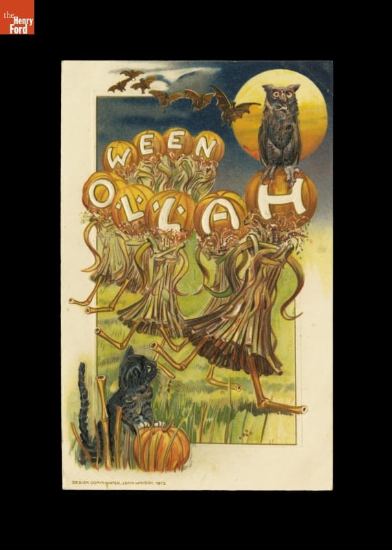By the late 1800s, a distinct blend of Halloween customs had emerged in the United States. The holiday was mostly an innocent celebration of mystery and fun into the 20th century, though traditions often reflected Halloween's supernatural origins. This colorful, spooky greeting postcard from 1913 alludes to olden customs and beliefs about the spiritual world.