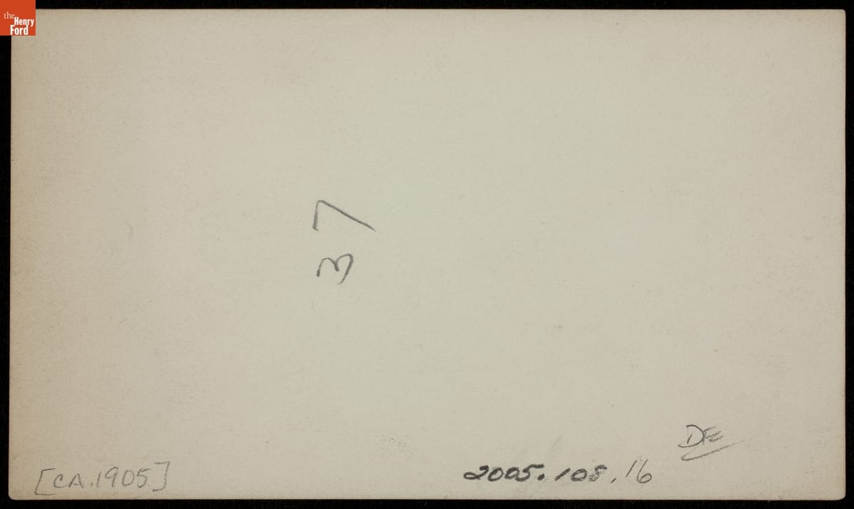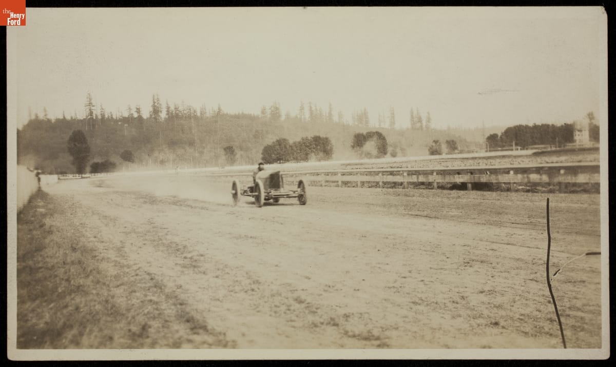 From 1904 to 1908, Barney Oldfield drove the Peerless "Green Dragon" at race meets and exhibition events throughout the United States. Some of these competitions took place at local horse tracks. This photograph shows the cigar-chomping racer speeding down a dirt-covered raceway.