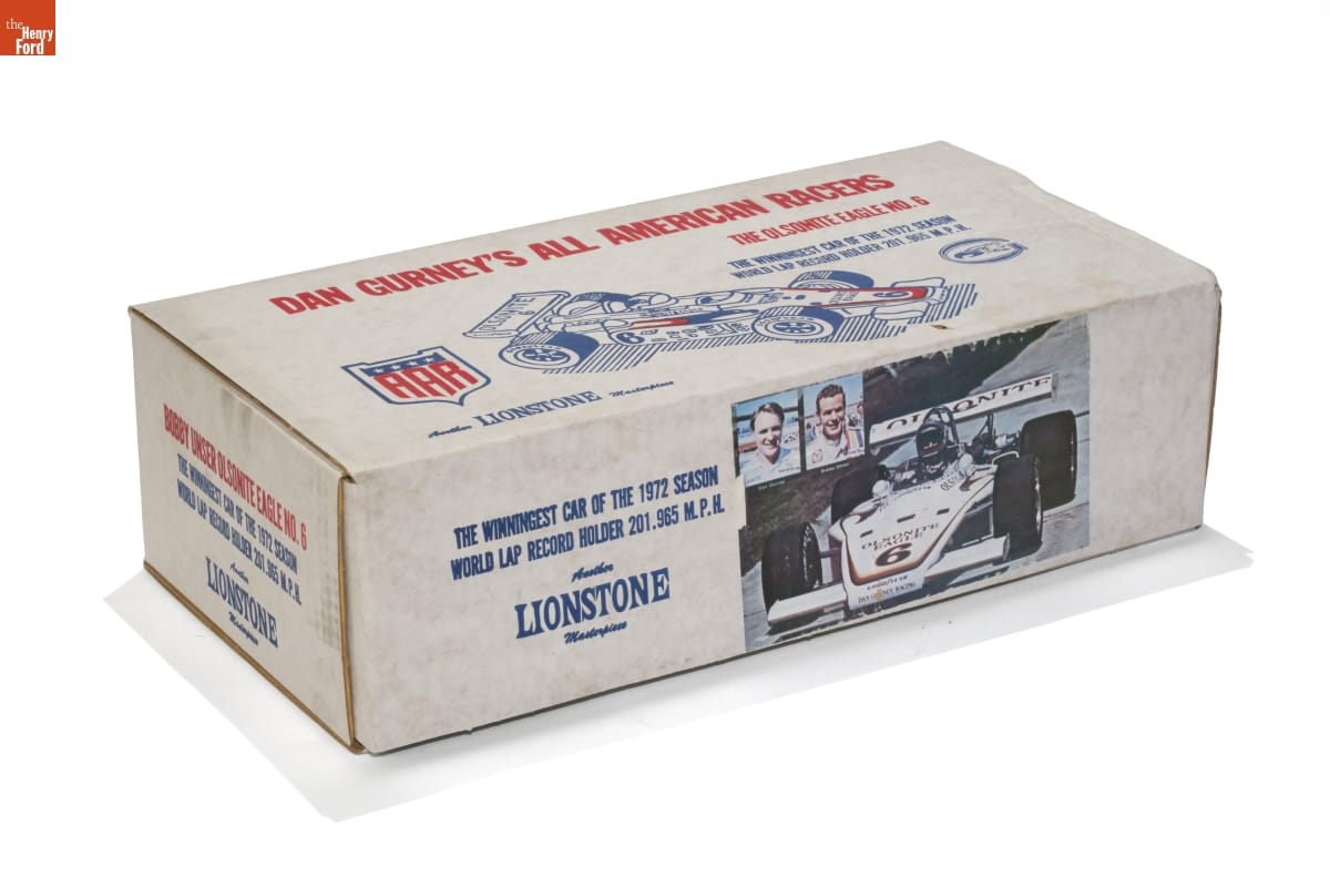 On top of box: DAN GURNEY'S ALL AMERICAN RACERS/ THE OLSONITE EAGLE NO. 6/ THE WINNINGEST CAR OF THE 1972 SEASON/ WORLD LAP RECORD HOLDER 201.965 M.P.H./ AAR/ Another LIONSTONE Masterpiece On end of box: Another LIONSTONE Masterpiece/ KENTUCKY STRAIGHT BOURBON WHISKEY/ 4/5 QUART - 86 PROOF/ BOTTLED IN BARDSTOWN, KY./ BY LIONSTONE DISTILLERIES, LTD./ ©LDL 1973 Stamped on bottom of bottle: "Original Lionstone Sculptured Porcelain/ ©1973 LDL Limited Edition"/ DES.B.MASENSTAR On bottom, printed faux autograph decals in script: Bobby Unser/ Dan Gurney