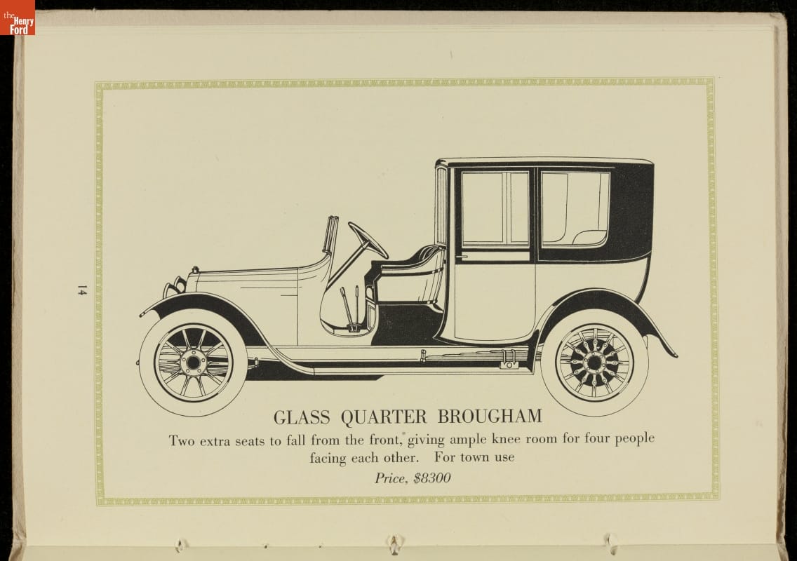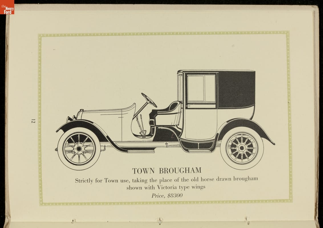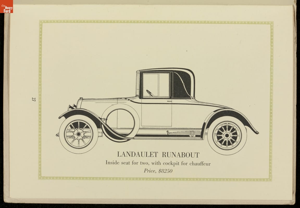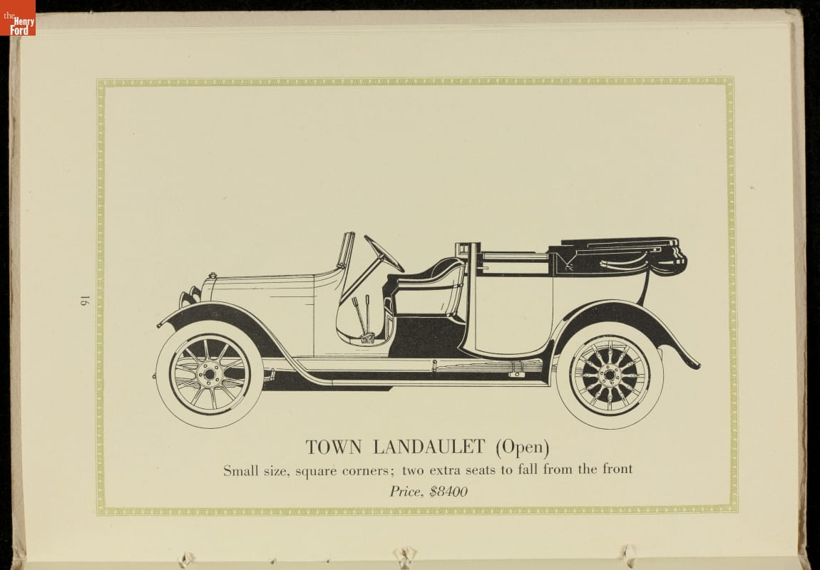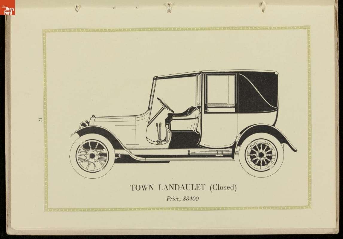 This 1917 Brewster and Company sales catalog features the Town Landaulet. "Landaulet" is a car body style with separate compartments for passengers and driver. The passenger compartment is usually convertible, while the driver's compartment can be either enclosed or open.