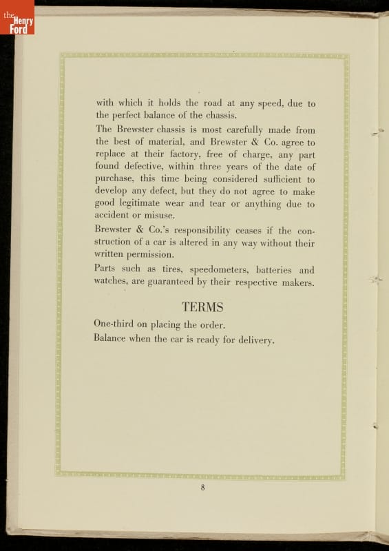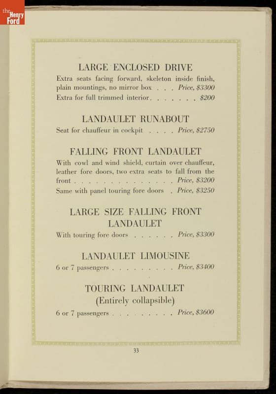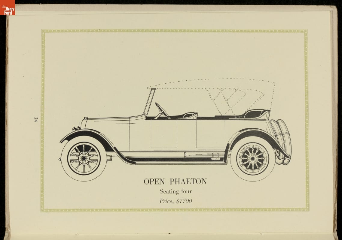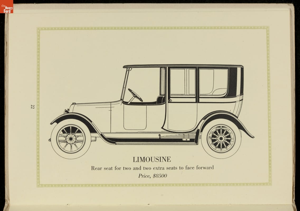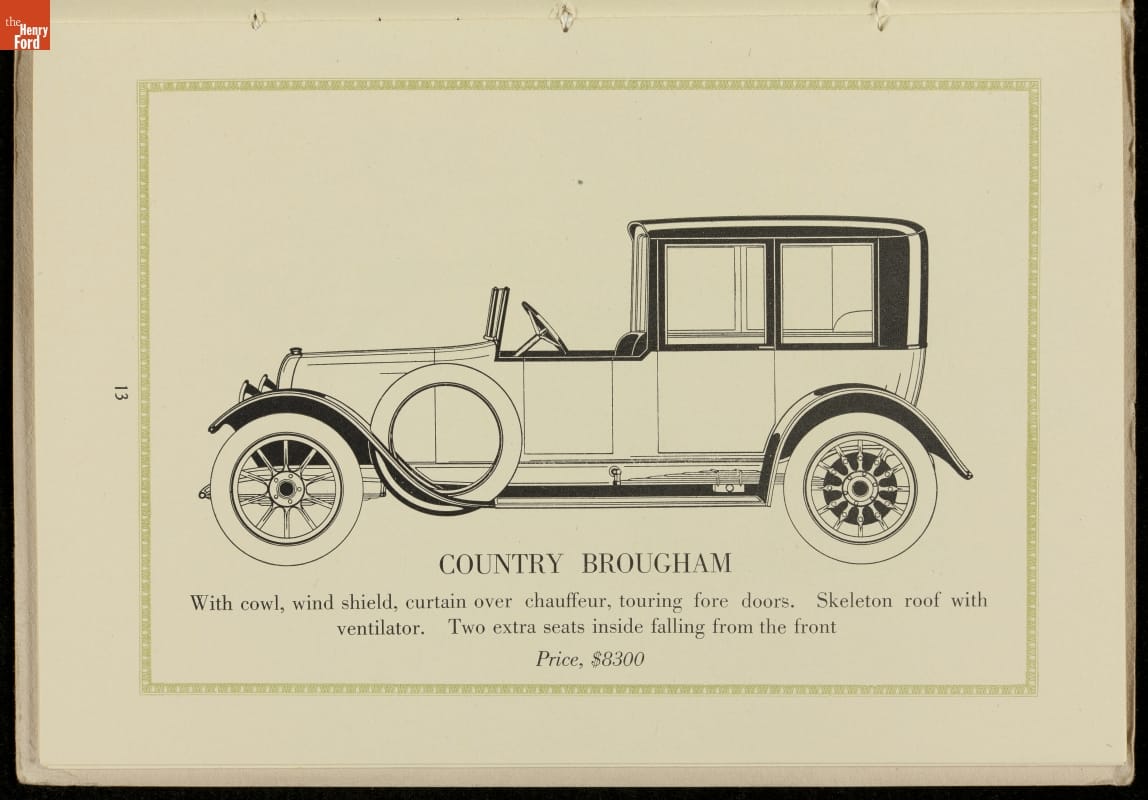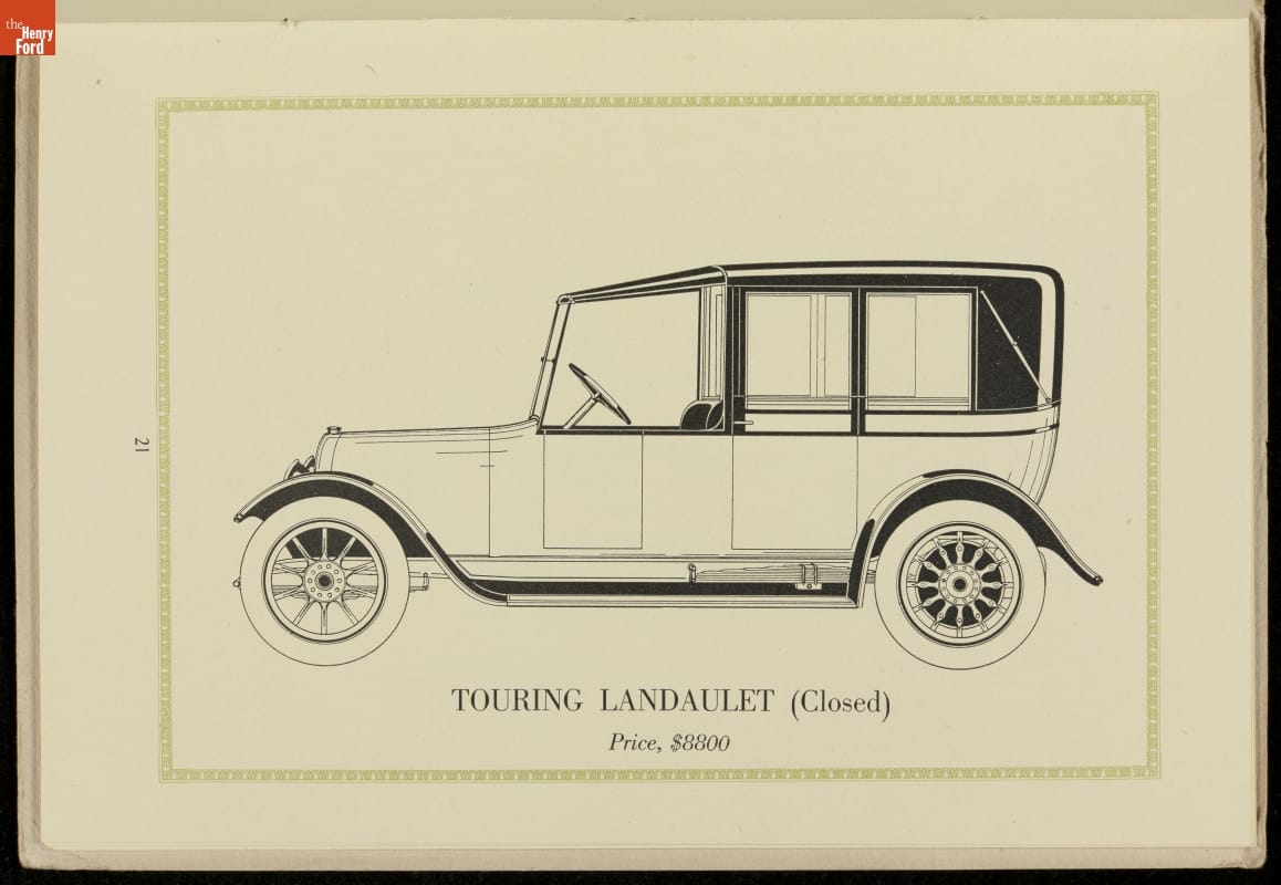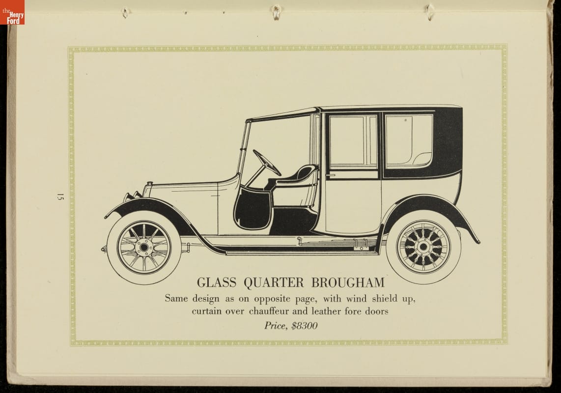 This 1917 Brewster and Company sales catalog features the Town Landaulet. "Landaulet" is a car body style with separate compartments for passengers and driver. The passenger compartment is usually convertible, while the driver's compartment can be either enclosed or open.