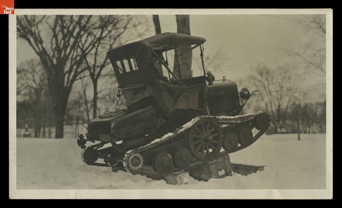 The versatile Ford Model T could be -- and was -- adapted into any number of special-use vehicles. This photograph shows a two-seat Model T runabout with its wheels replaced by tank-style tracks. The continuous tracks gave this unusual T the ability to travel through deep snow and climb steep hills.