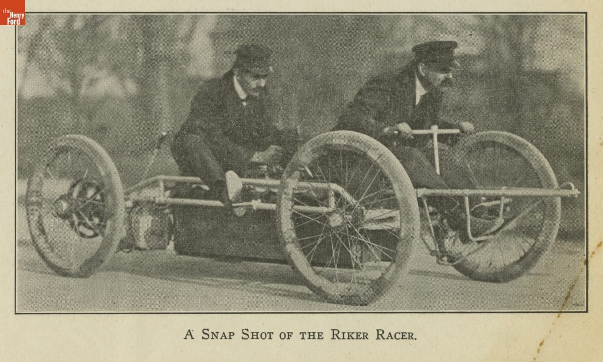 The Horseless Age was an early well-known automobile journal. This volume from 1901 contains an image of Andrew Riker driving his electric vehicle in time trial races at Coney Island. Riker set a world record for electrics on this one-mile course.