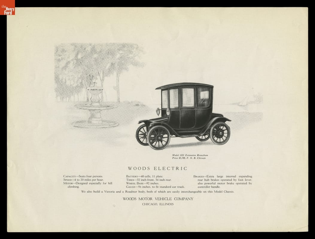 Woods Motor Vehicle Company began manufacturing electric vehicles in 1899. This 1913 catalog shows vehicles available to buyers. A few years later, Woods introduced a dual-power vehicle powered by gasoline and electric batteries. The company, however, did not survive.