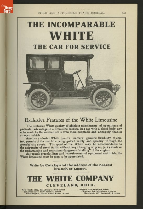 Early automotive periodicals kept car owners up-to-date with new trends and inventions. Car companies also advertised their vehicles. In this 1908 issue of Cycle and Automobile Trade Journal, The White Company promoted their steam-powered car. If you read closely though, the company never mentioned that the car runs on steam.