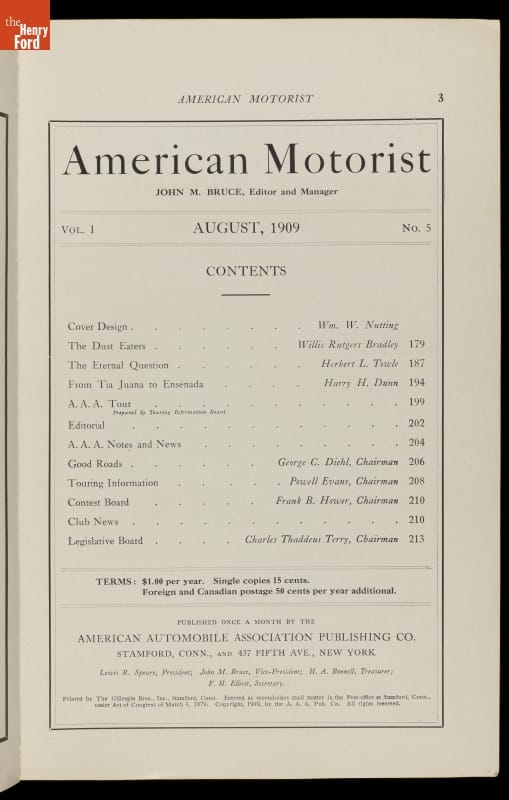 The American Automobile Association (AAA) was organized in 1902. It began publishing its official magazine, American Motorist, in 1909. Early issues featured travel articles, hotel and garage listings, and club news. The magazine also promoted the idea of good roads.