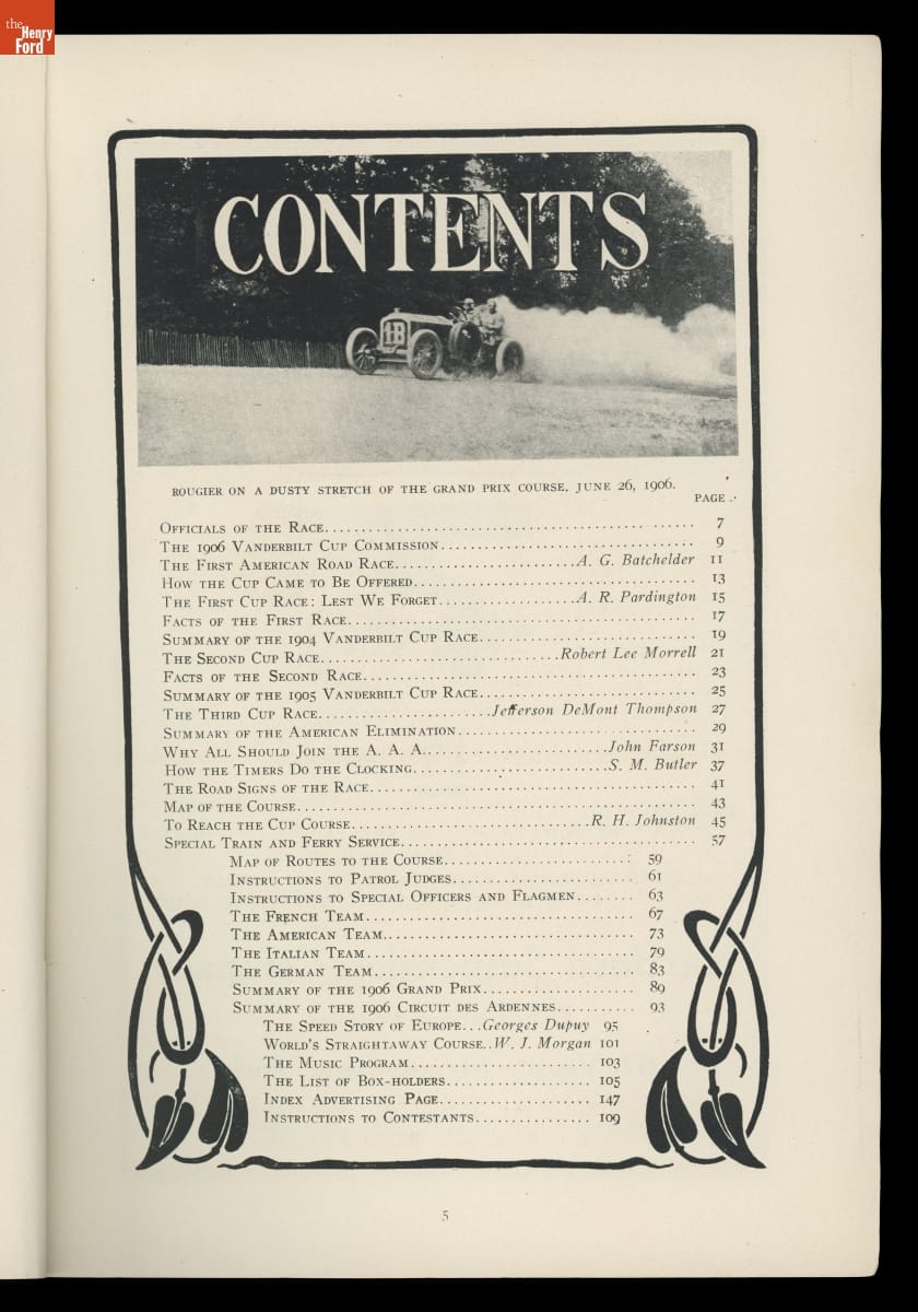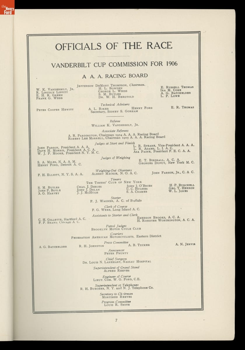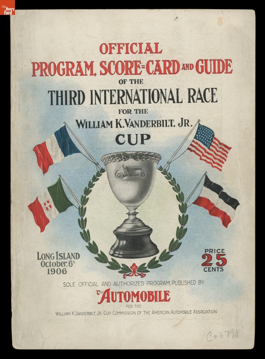 The Vanderbilt Cup, held on New York's Long Island from 1904 to 1910, was America's first internationally prominent automobile race. William K. Vanderbilt, Jr., a wealthy railroad heir, organized the competition over public roads. European cars dominated the event's first years. This program is from the 1906 race, won by French driver Louis Wagner in a French-built Darracq.