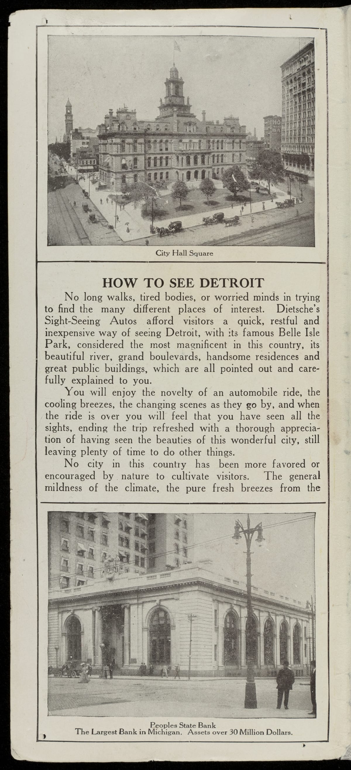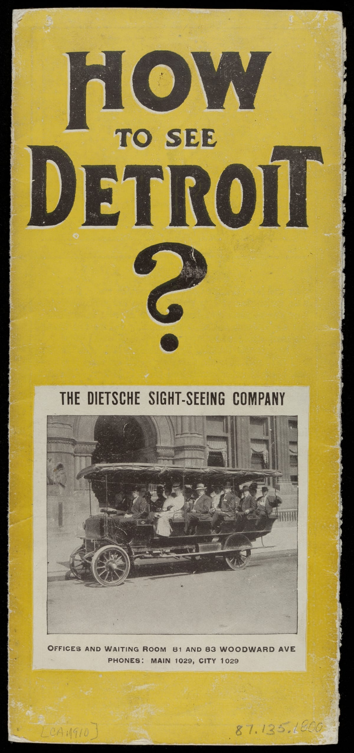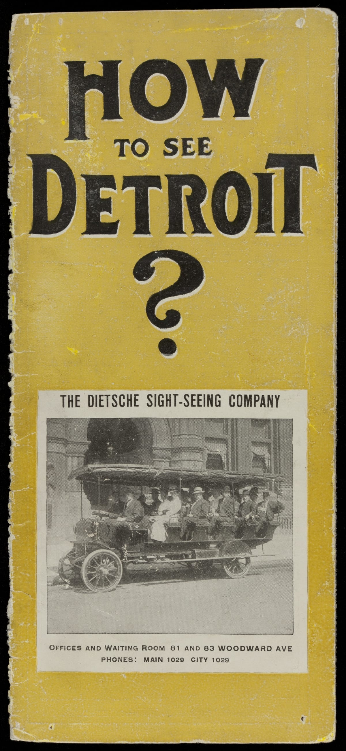 Cities became a more popular vacation destination around the turn of the 20th century, delighting tourists with the latest modern technology, artistic and scientific curiosities, and live entertainment. Commercial sightseeing tours helped simplify attractions, districts, and landmarks for city tourists. This circa 1910 brochure provided the answer to "How to See Detroit?" -- Dietsche's Sight-Seeing Autos.