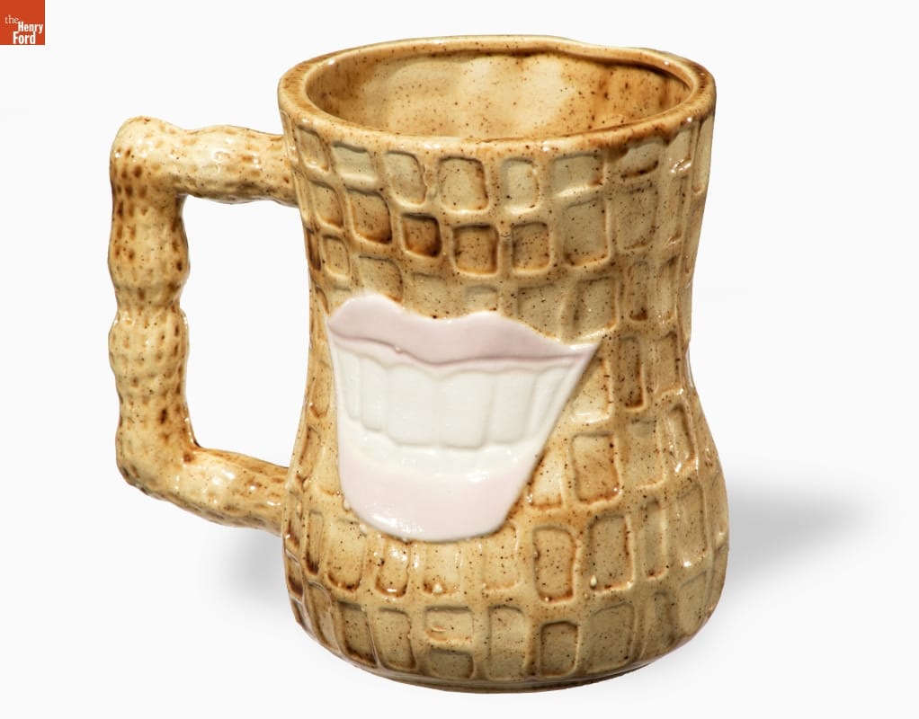 Democrats selected Jimmy Carter as their presidential nominee in 1976 and 1980. Carter was a naval officer and successful peanut farmer before entering politics. His association with peanut farming figured prominently in campaign materials--both for and against him. This peanut mug also depicts a toothy smile--another signature representation of the candidate used in campaign items.