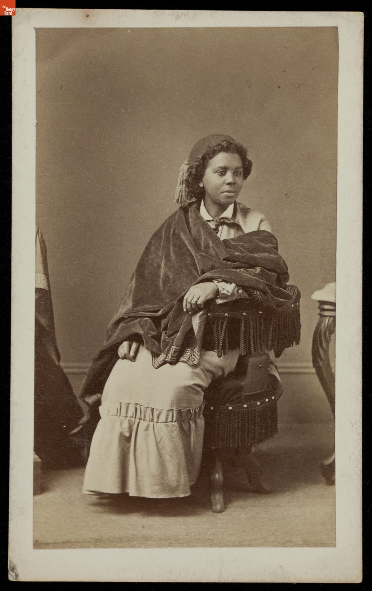 Edmonia Lewis, a renowned sculptor of African-American and Native American heritage who worked primarily in Rome, posed for this carte-de-visite when she traveled to Chicago in 1870. Cartes-de-visite, small photographic prints on cardboard stock, remained popular from the Civil War in the 1860s through the 1880s. Americans commonly collected and exchanged them to commemorate family members or celebrities.