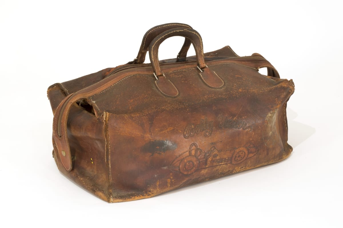Bobby Unser competed successfully in nearly every form of auto racing but was best known for his three Indianapolis 500 wins and his 13 Pikes Peak International Hill Climb victories. He used this duffel bag to carry his racing helmet and gear throughout most of his career. Unser designed the bag himself and had it custom made by a saddlemaker.