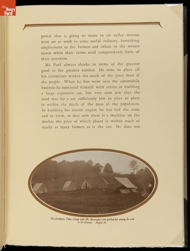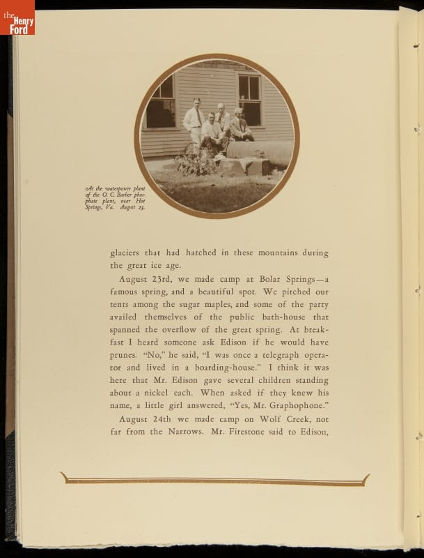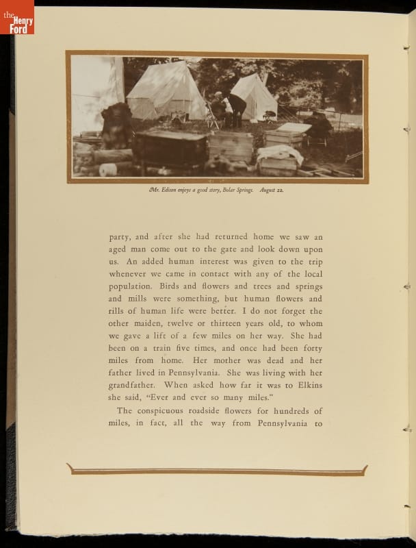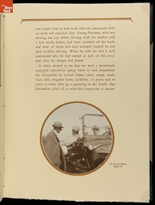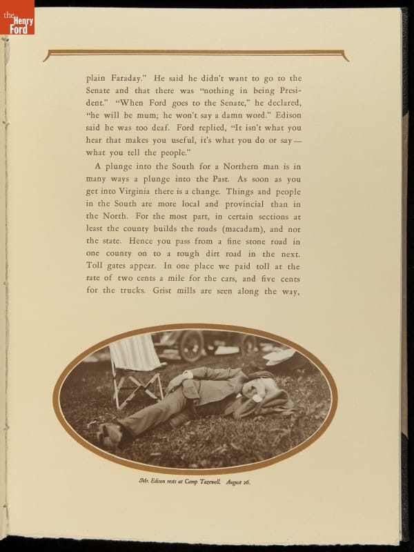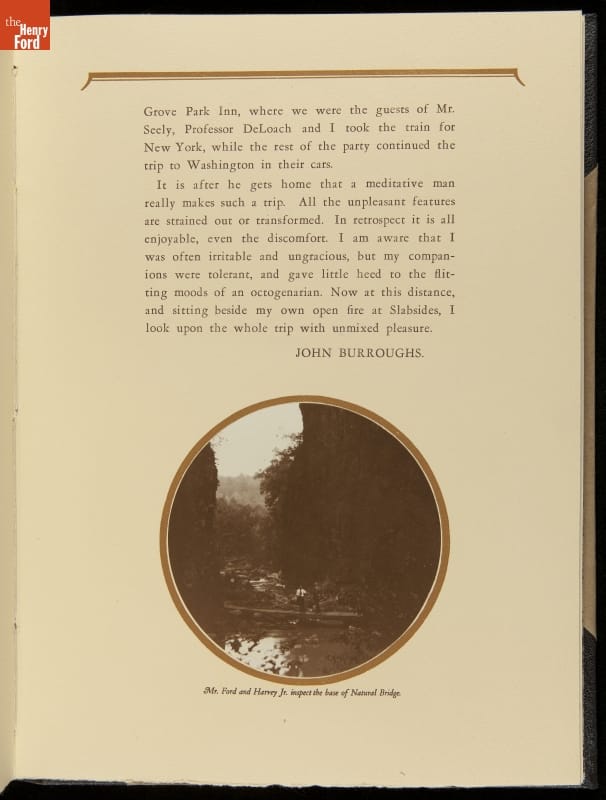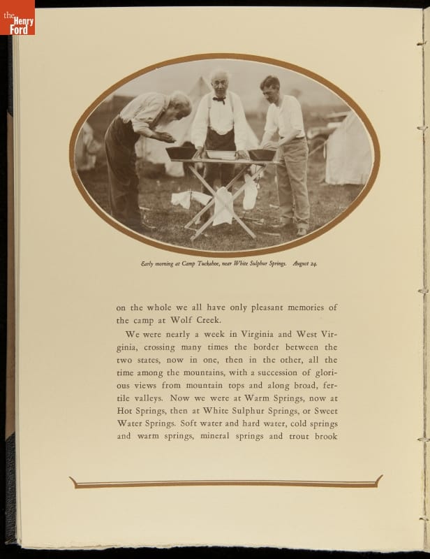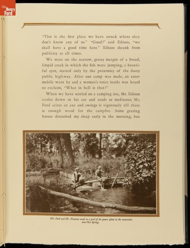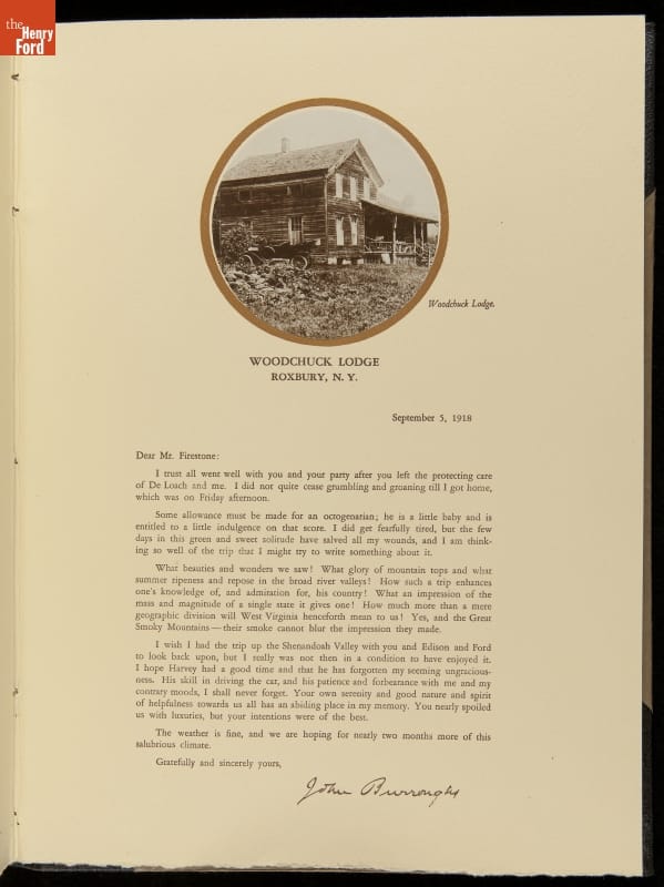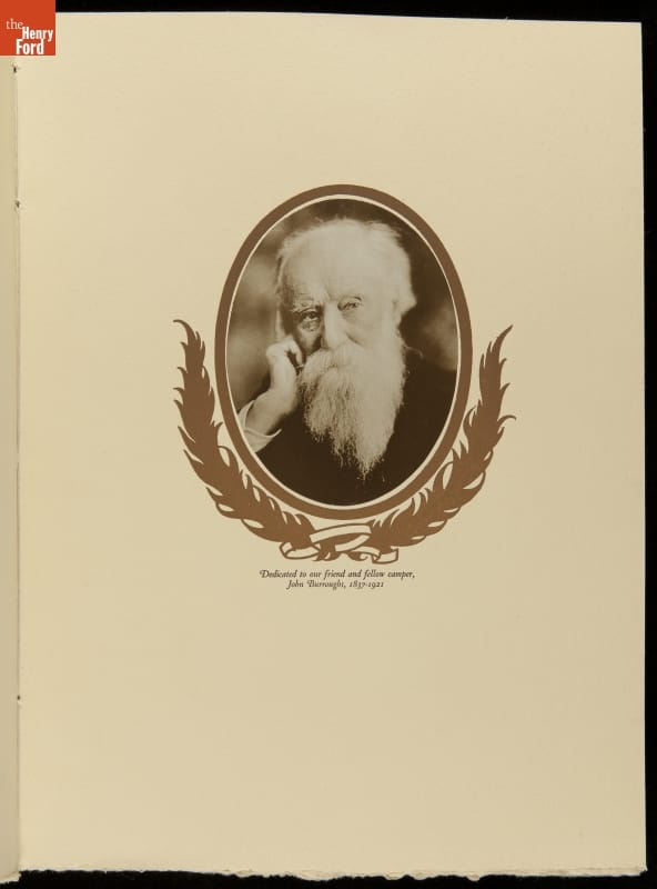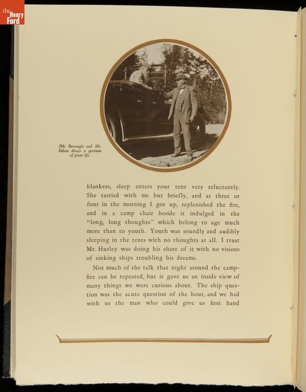 John Burroughs chronicled the Vagabonds' 1918 camping trip through the central Appalachians. The self-named Vagabonds -- Henry Ford, Thomas Edison, Harvey Firestone, and Burroughs -- began taking excursions in 1916 to relax and enjoy each other's company. They were joined by a fifth, Edward Hurley, on this adventure. Firestone later privately published Burroughs's "mock-up" under this title, Our Vacation Days of 1918.