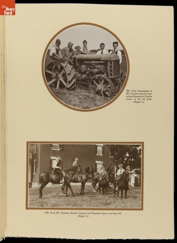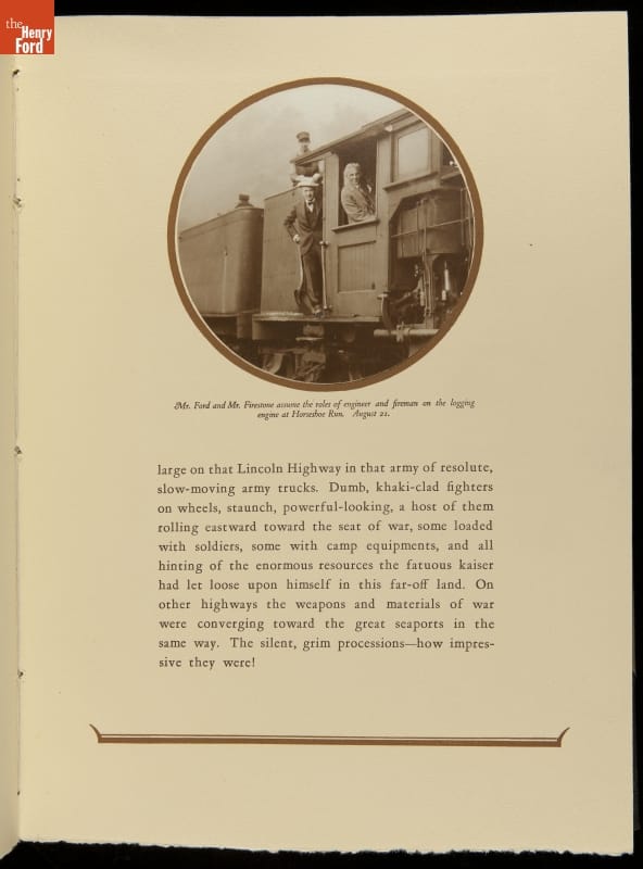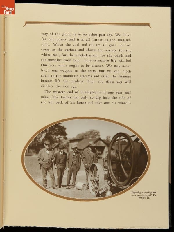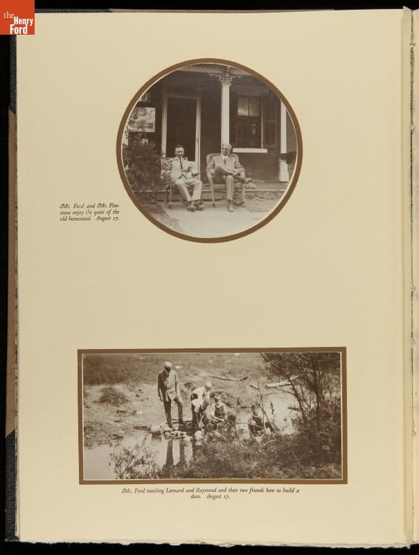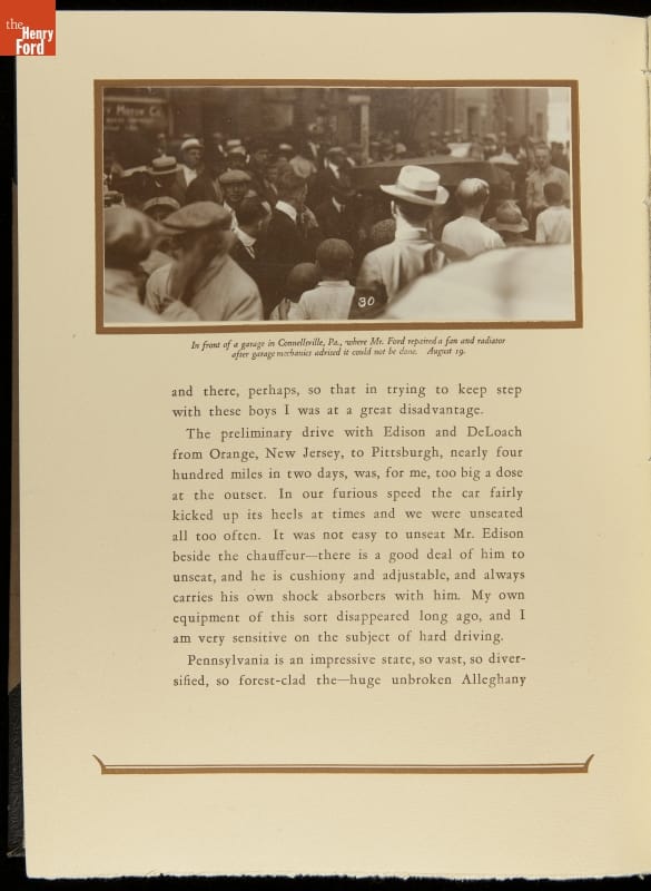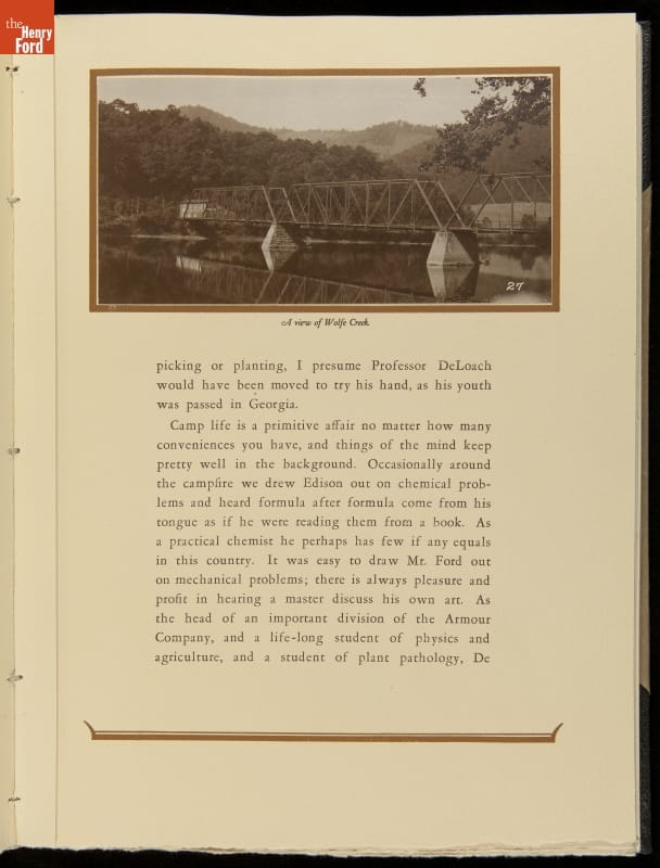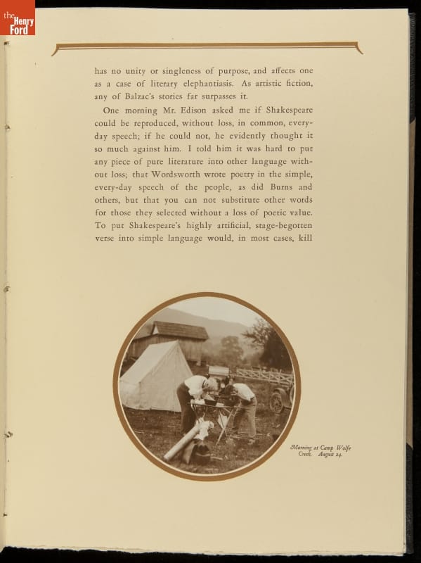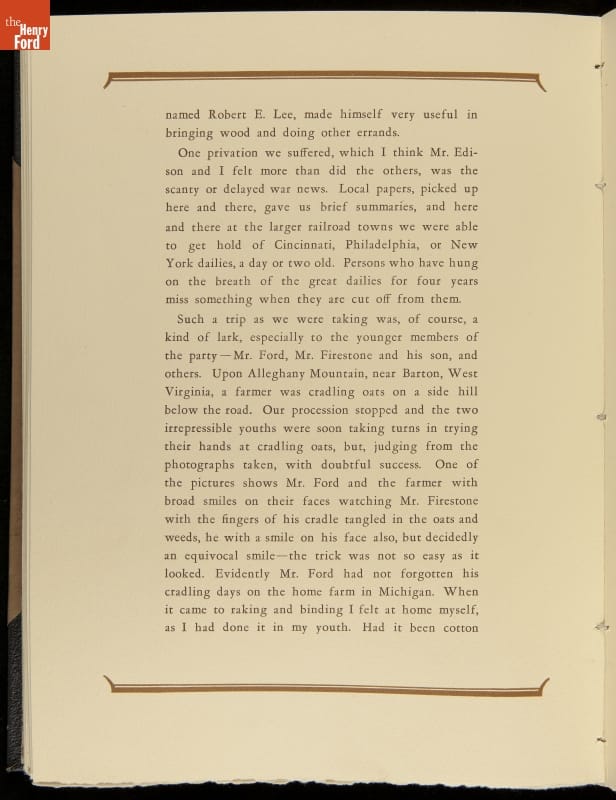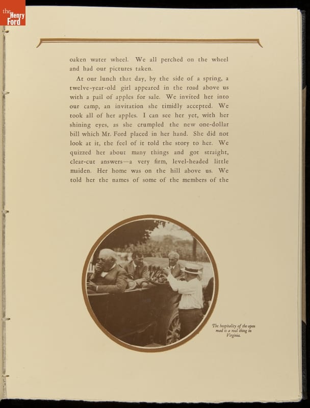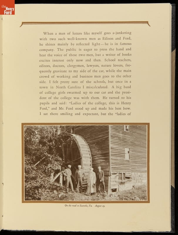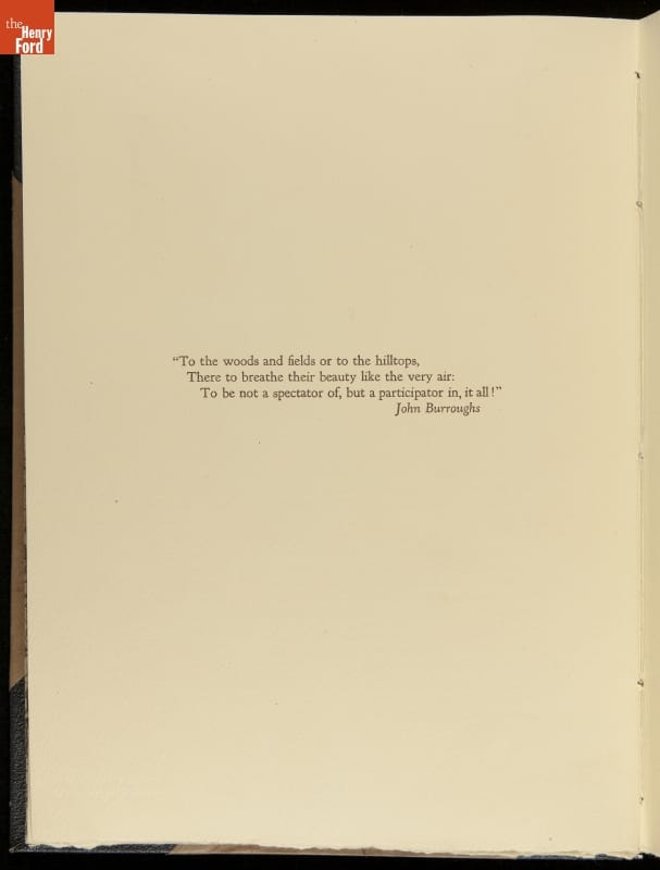John Burroughs chronicled the Vagabonds' 1918 camping trip through the central Appalachians. The self-named Vagabonds -- Henry Ford, Thomas Edison, Harvey Firestone, and Burroughs -- began taking excursions in 1916 to relax and enjoy each other's company. They were joined by a fifth, Edward Hurley, on this adventure. Firestone later privately published Burroughs's "mock-up" under this title, Our Vacation Days of 1918.
