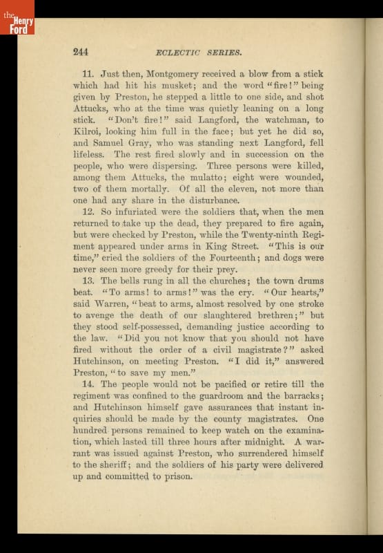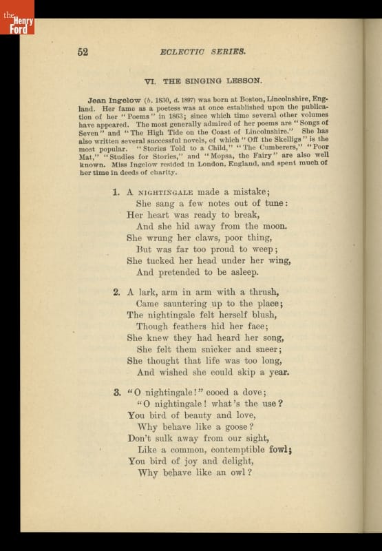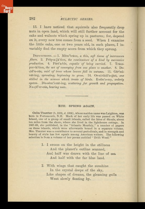 The McGuffey Readers textbook series was used in American schools during the nineteenth and early twentieth centuries. The Readers emphasized the fundamental skills of reading and writing but included stories on a wide range of subjects from many sources (hence, "eclectic"). The books were also intended to develop proper character in children, and had a religious overtone.