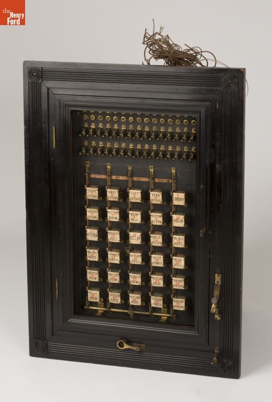 Annunciators were call systems that alerted servants to the needs of the household in which they worked. Each room contained a button to trigger the annunciator housed in servant's quarters. Primitive 18th-century bell systems evolved with the rise of battery power, telegraphy, and home electrification. This device was from the Charles F. Brush mansion, inventor of the arc lamp.