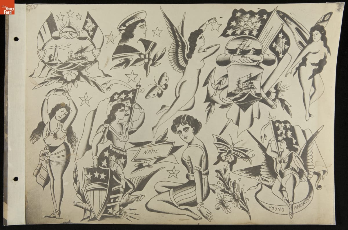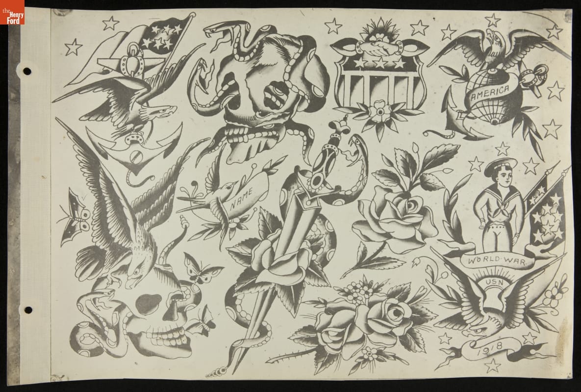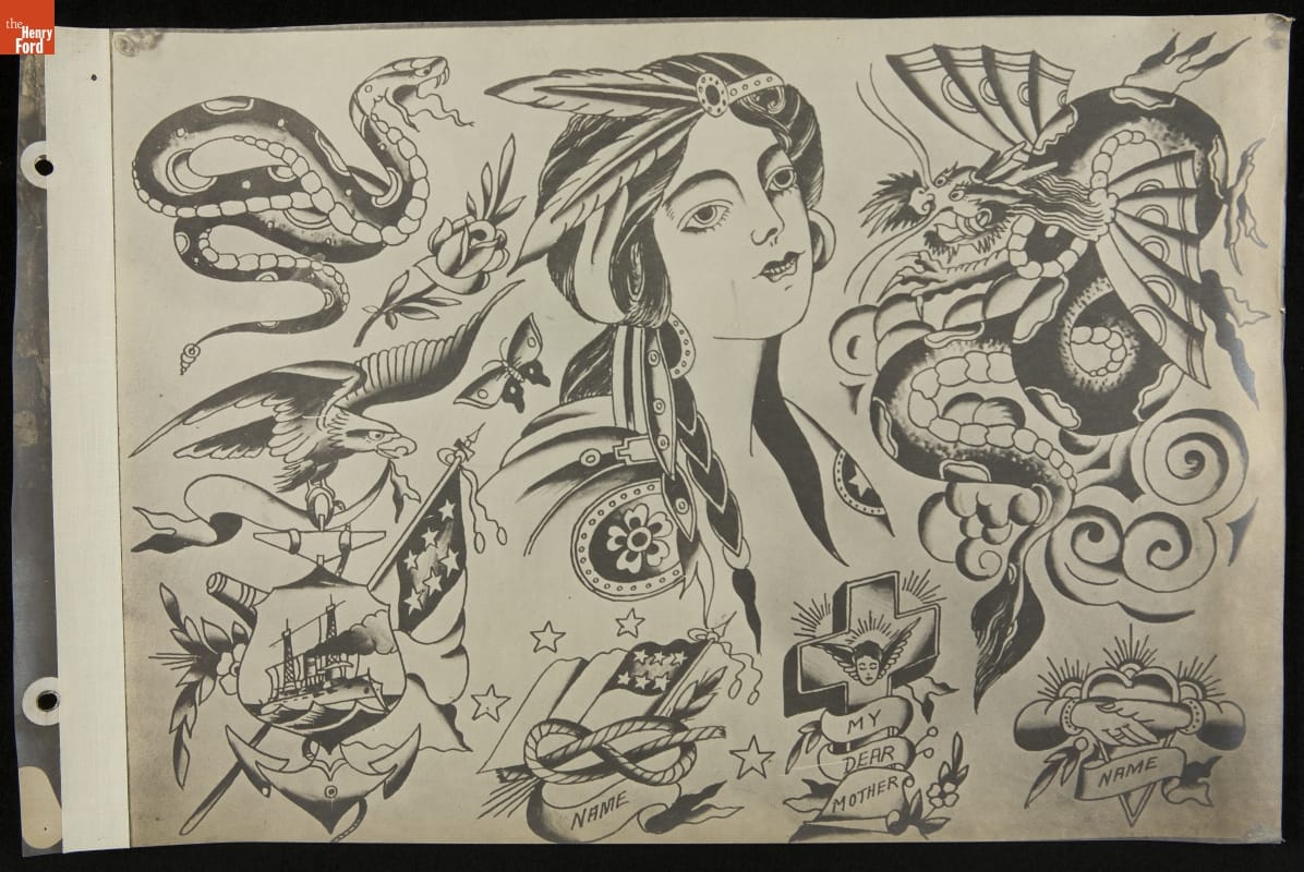 Tattoos communicate stories. Their content ranges from deeply personal and traditional--to regrettable and frivolous. In the early 1900s, "Professor" Waters apprenticed as a tattoo artist in carnivals and New York's Bowery District. He ran a successful supply shop in Detroit (1918-1939), patenting the standard "two-coil" tattoo machine in 1929. Designs from his flash sheets continue to inspire tattooists today.