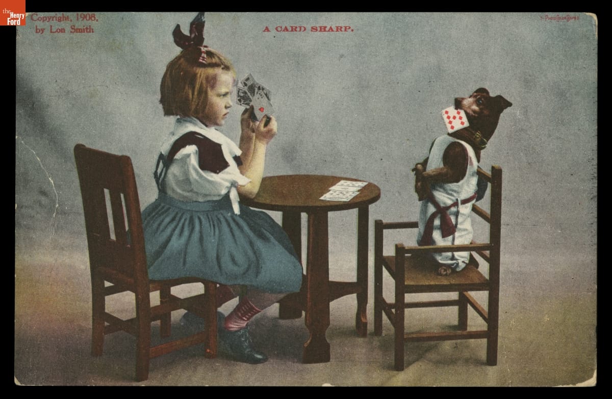 Postcard, Girl and Dog Playing Cards, "A Card Sharp," 1908