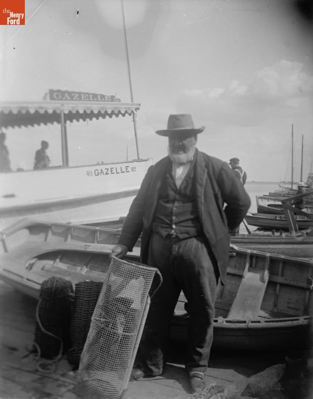 Captain Johnson with Fishing Trap and Boat, Canarsie, Brooklyn, New York, 1890-1915