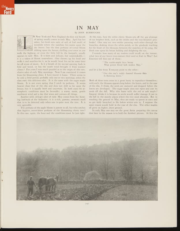 Magazine published by Review of REviews Book Company. Article "In May" written by John Burroughs, with photograph by Rudolf Eickemeyer, Jr.