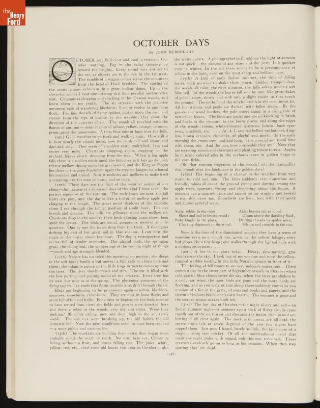 Magazine published by Review of REviews Book Company. Article "October Days" written by John Burroughs, with photograph by A. G. Eldridge.