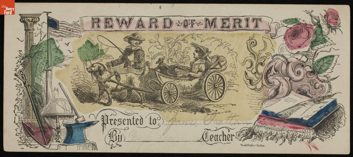 During the nineteenth-century, teachers recognized students with paper "rewards of merit." These small tokens commended a student's excellent work, perfect attendance, good behavior or other noteworthy accomplishment. Some contained simple handwritten sentiments from the teacher to the pupil. Many were printed and colorful, with space available to write in the student's name as well as their own.