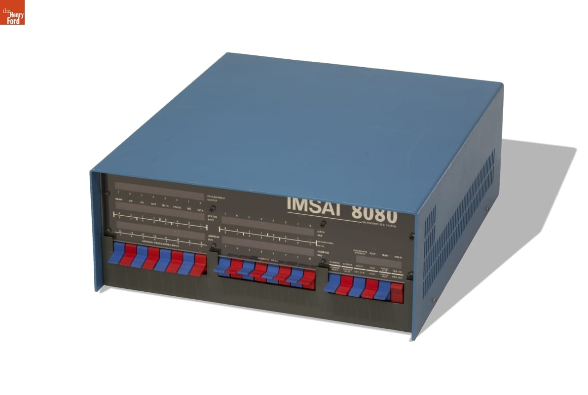 The IMSAI 8080 was a clone of the Altair 8800, the first mass marketed personal computer. It was a popular "kit computer," requiring assembly and programming. With no keyboard, toggle switches allowed input and LED lights signaled output. This could be modified using an IBM I/O typewriter. The donor, O.S. Narayanaswami, was a mechanical engineer interested in the educative power of computers.