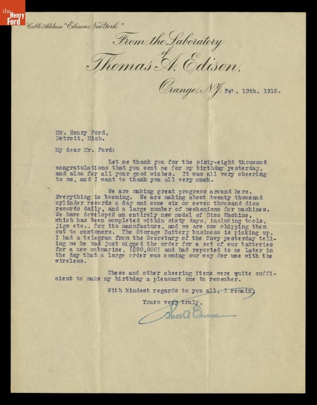 Letter from Thomas Edison to Henry Ford, February 13, 1915