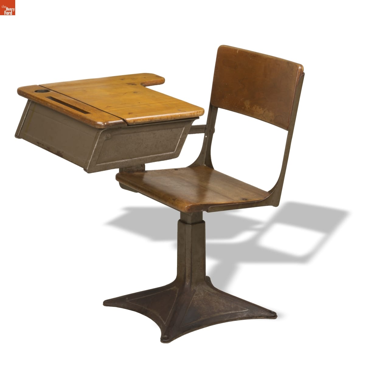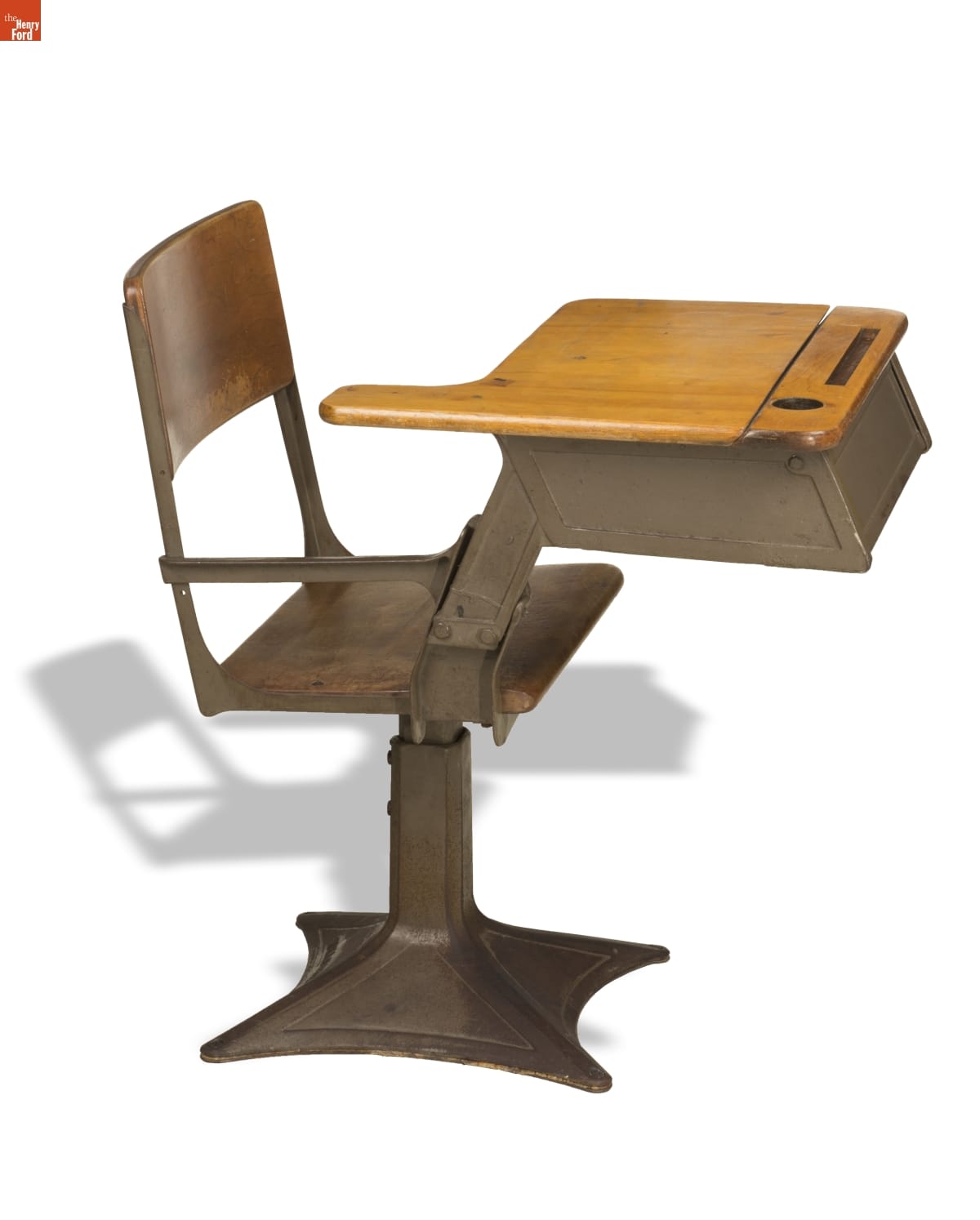 This type of desk became the standard for both public and private elementary schools after World War II. Students were responsible for supplying and organizing their school supplies, which were stored under the hinged desk top. These desks continued to be used in classrooms even after dip pens and ink bottles were replaced by cartridge pens and, eventually, ballpoint pens.