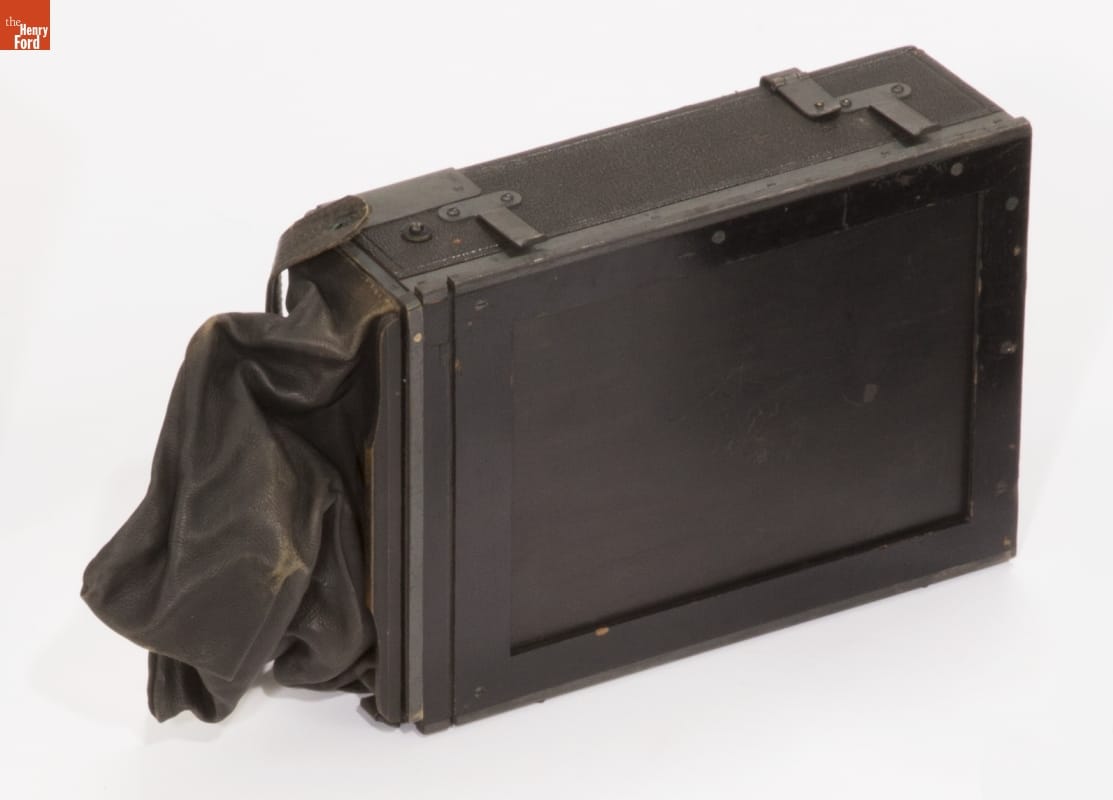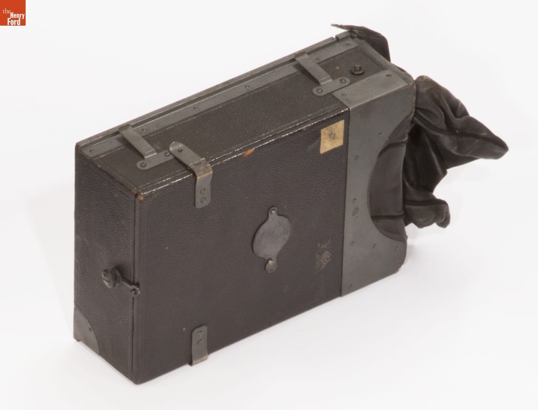 This Graflex aerial camera magazine holds multiple sheets of film. Film sheets are loaded into the metal body of the magazine. After making an exposure a lever slides towards the leather bag; the film shifts into the attached bag and then up into the stack of film sheets. Safe from further exposure by light, the film remains here until processing.