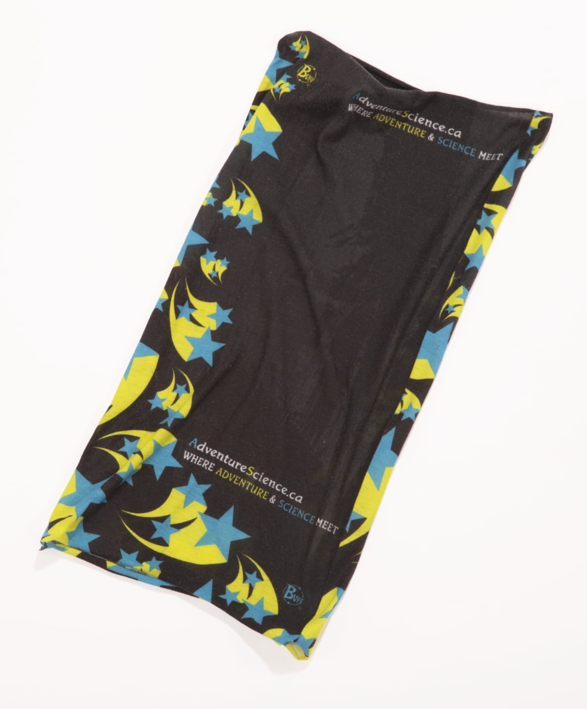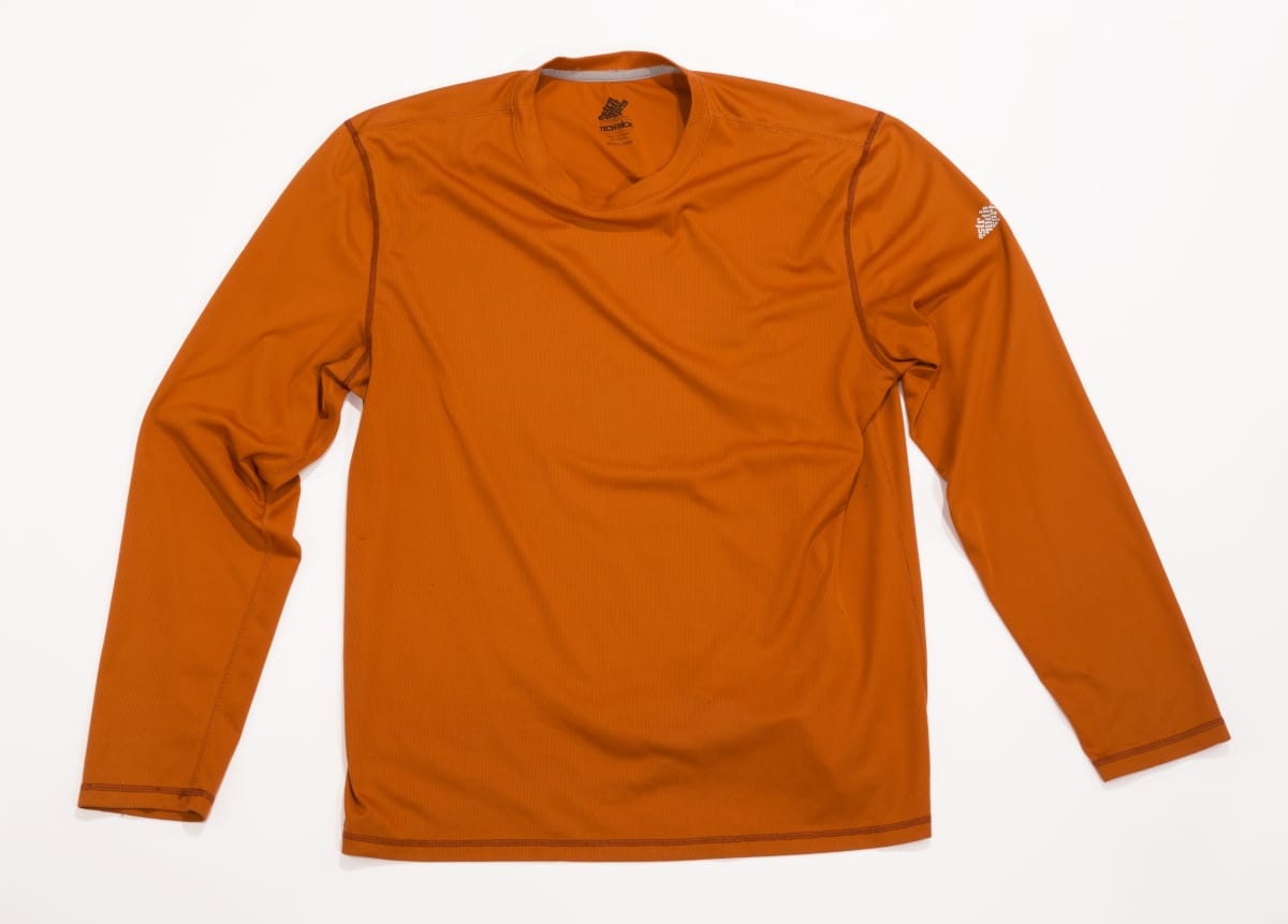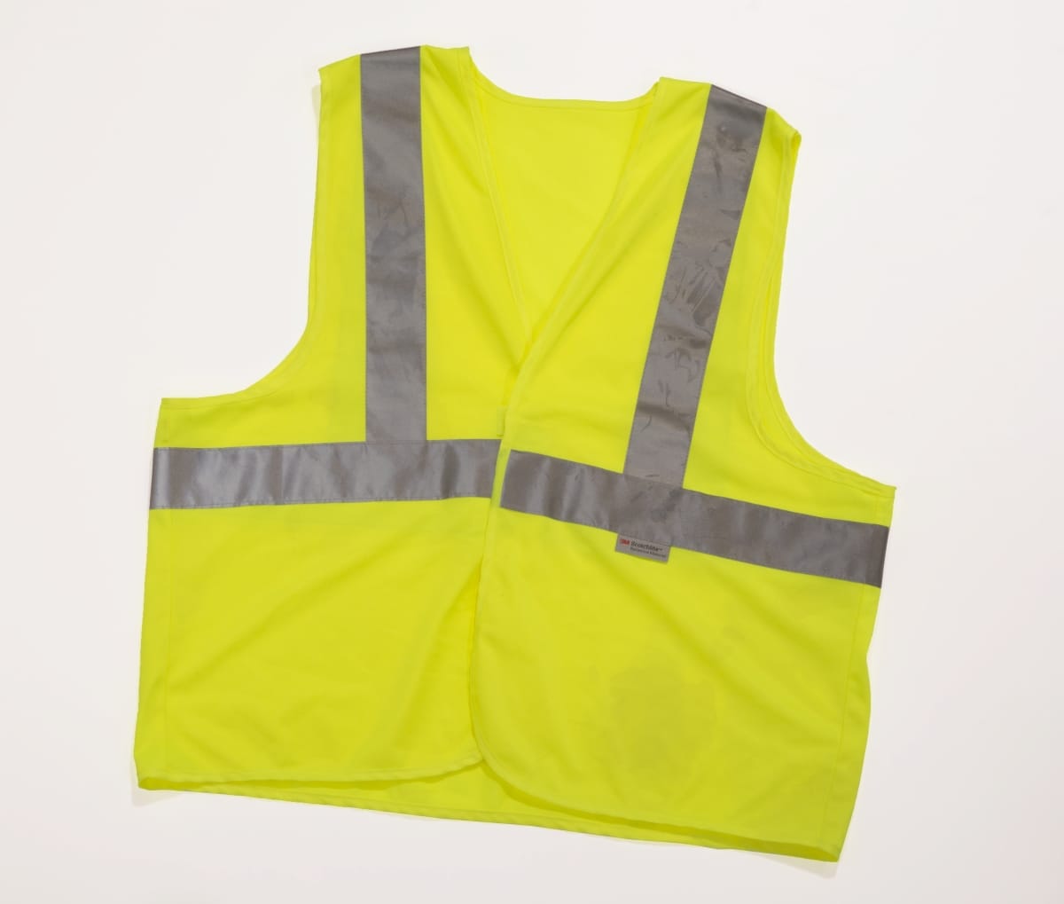 on shirt, upper left sleeve: estr[n] mntn sprts on shirt, lower right sleeve: TECHWICK on shirt, inside back collar: estrn mntn sprts / EASTERN MOUNTAIN SPORTS / TECHWICK / Made in El Salvador / 100% Polyester MENS LARGE on headgear, top and bottom: AdventureScience.ca / WHERE ADVENTURE & SCIENCE MEET on vest, on tag on front right side: 3M Scotchline Reflective Material on respirator, on yellow stickers: 3M 6092 / NIOSH on side of boots: JEWSON / CE EN 345-1 / G2/44/S8 / 37 99