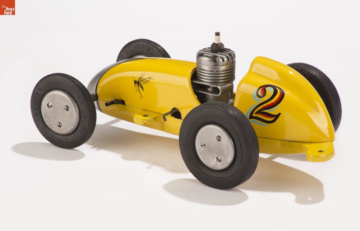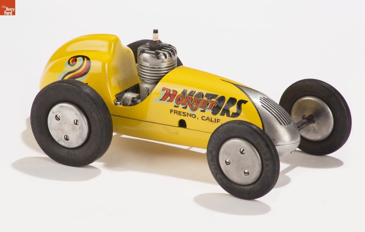 Tether cars, gas-powered model race cars, were popular in the 1930s and 1940s. They were raced individually while tethered to a central pivot, or against each other on a scaled-down board track. This "Mite" model, from Hornet Motor Manufacturing Company, was powered by a .199-cubic-inch engine. The tabs for attaching the tether were cast into the belly pan.