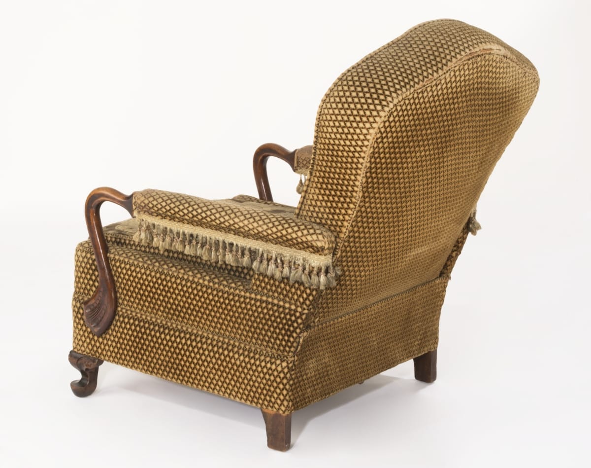 This reclining chair was one of the first upholstered chairs produced by La-Z-Boy co-founders Edwin Shoemaker and Edward Knabusch. The earliest La-Z-Boys featured a patented reclining system and included a separate ottoman. Later technical refinements would produce a built-in footrest, eliminating the need for an ottoman and leading to the modern La-Z-Boy recliner.