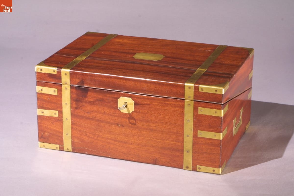 Made of mahogany, ivory, and brass, this portable writing desk has a mechanism for copying text and secret drawers for hiding documents. Thomas Jefferson designed a similar combination portable writing desk and copying press. This may be an example of his design made in England or France, or it may be the product of another clever inventor.