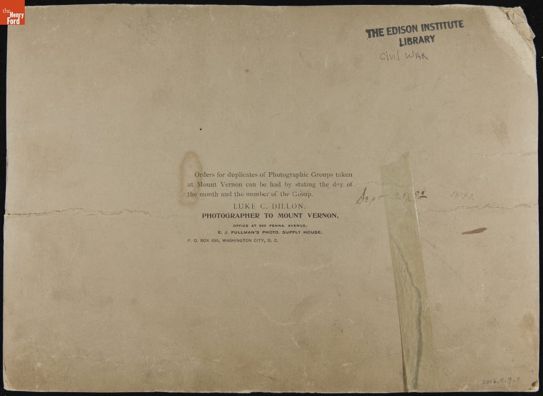printed on back: Orders for duplicates of Photographic Groups taken / at Mount Vernon can be had by stating the day of / the month and the number of the Group. / LUKE C. DILLON, / PHOTOGRAPHER TO MOUNT VERNON, / OFFICE AT 935 PENNA. AVENUE, / E. J. PULLMAN'S PHOTO. SUPPLY HOUSE. / P. O. BOX 655, WASHINGTON, D. C. handwritten on back: Sept 21, 92
