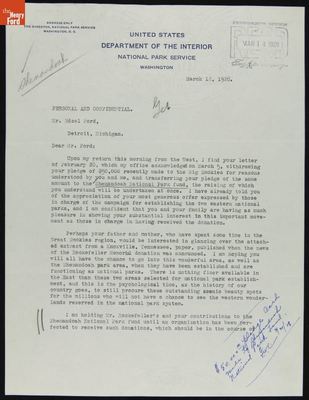 Letter from Arno Cammerer to Edsel Ford regarding Donation to Shenandoah National Park, March 12, 1928