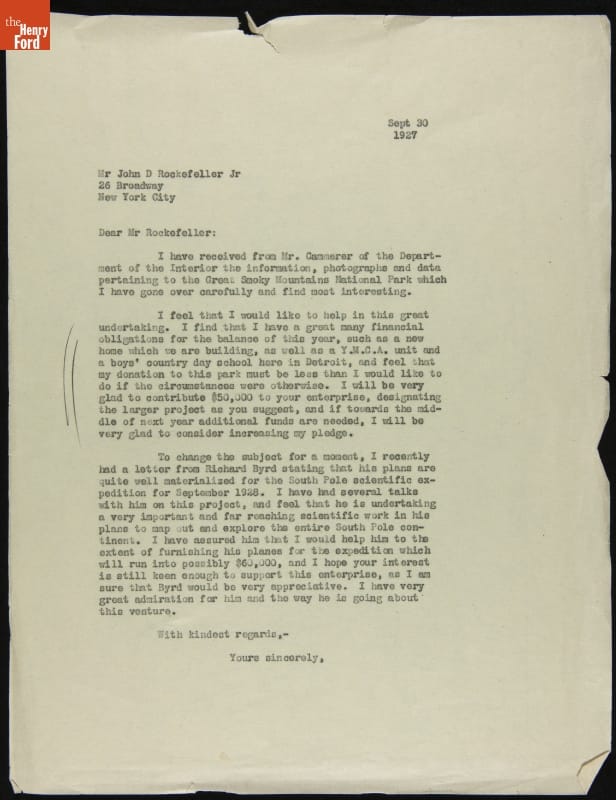 Letter from Edsel Ford to John D. Rockefeller Jr. regarding Donation to Great Smoky Mountains National Park, September 30, 1927