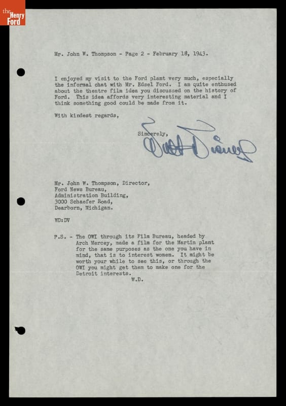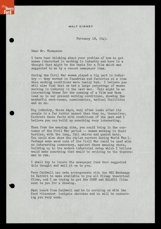 Letter from Walt Disney regarding Making a Ford Motor Company War Work for Women Film, February 18, 1943