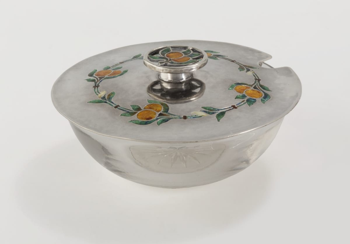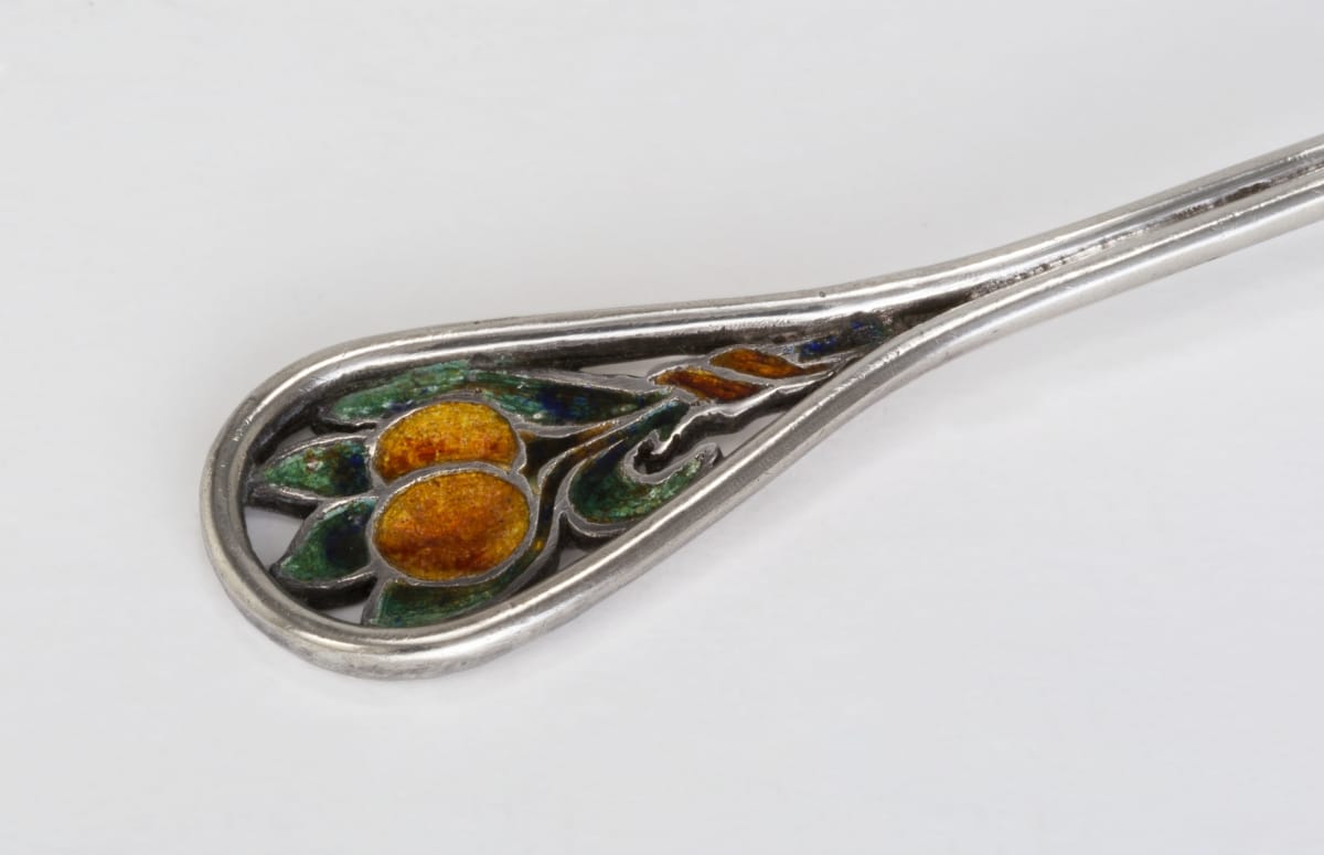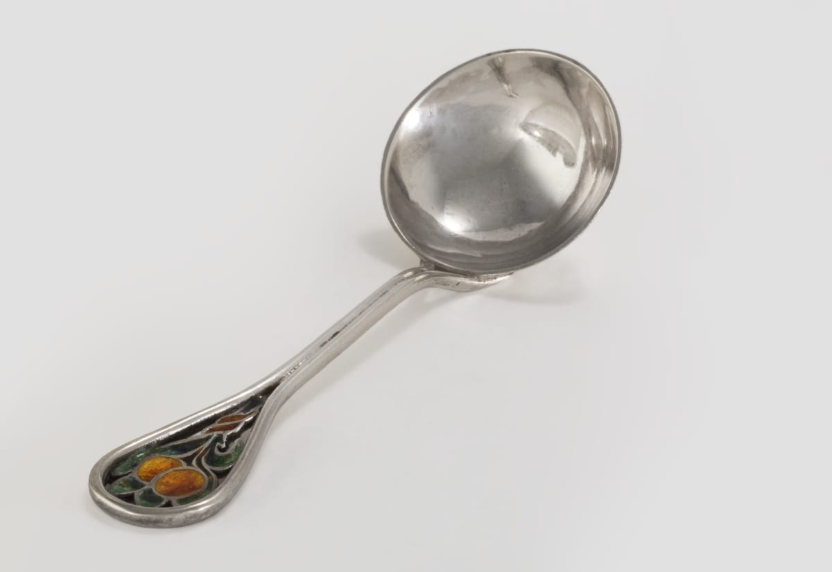 When Mary Peyton Winlock created this jam dish and spoon, early in the 20th century, she was recognized as a master silversmith, exhibiting at the Society of Arts and Crafts of Boston. Educated at the School of the Museum of Fine Arts, Boston in the 1890s, she specialized in creating jewelry and serving pieces, like this one, embellished with exquisite enamel work.