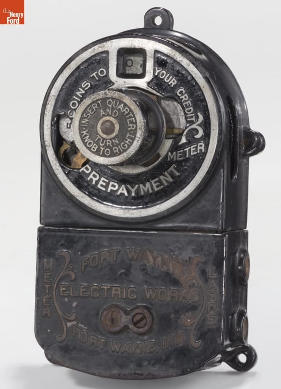 on face: COINS TO YOUR CREDIT/ PREPAYMENT METER on knob: INSERT QUARTER AND TURN KNOB TO RIGHT on front: FORT WAYNE/ ELECTRIC WORKS/ FORT WAYNE, IND./ METER/ LAMPS