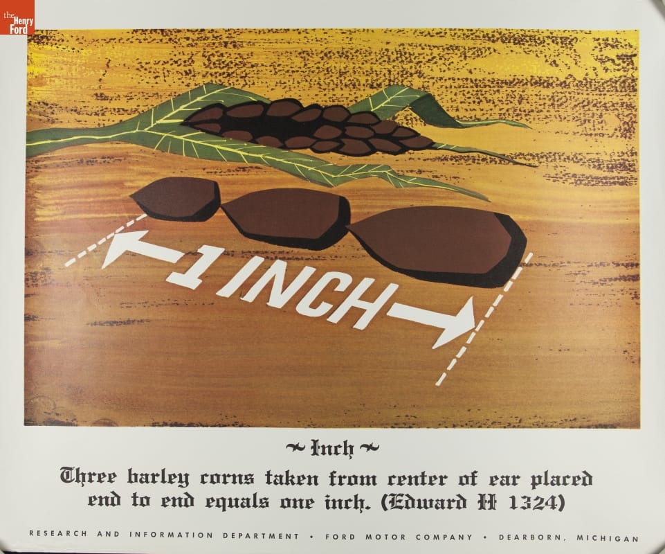 at bottom: Inch / Three barley corns taken from center of ear placed / end to end equals one inch. (Edward II 1324) / RESEARCH AND INFORMATION DEPARTMENT, FORD MOTOR COMPANY, DEARBORN, MICHIGAN